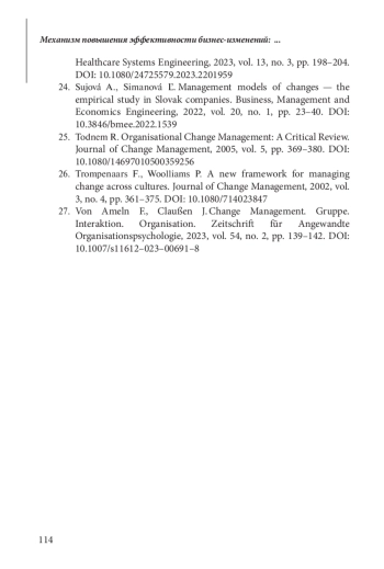 24. 	Sujová A., Simanová Ľ. Management models of changes - the empirical study in Slovak companies // Business, Management and Economics Engineering. 2022. Vol. 20. No. 1. P. 23-40. DOI: 10.3846/bmee.2022.15397