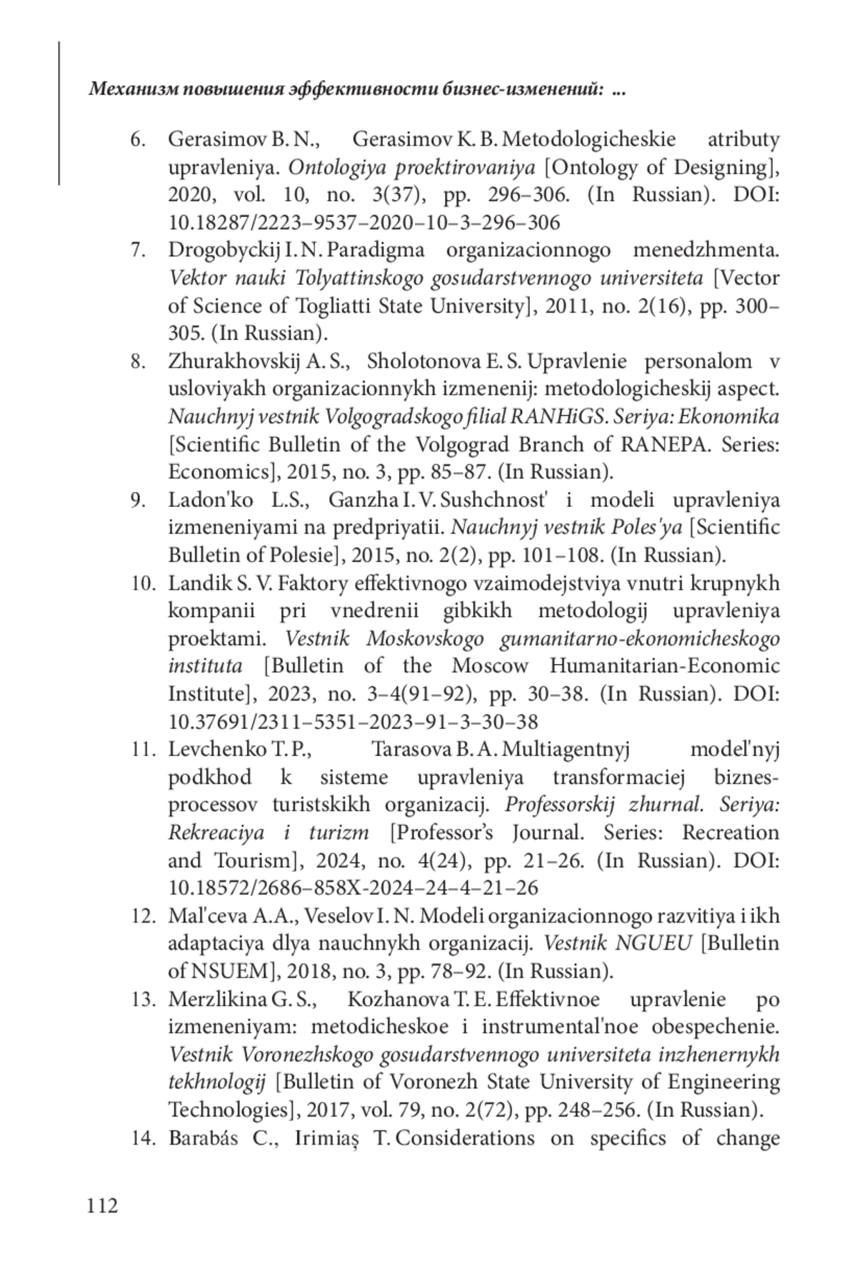 13. 	Мерзликина Г. С., Кожанова Т. Е. Эффективное управление по изменениям: методическое и инструментальное обеспечение // Вестник Воронежского государственного университета инженерных технологий. 2017. Т. 79. № 2(72). С. 248-256.