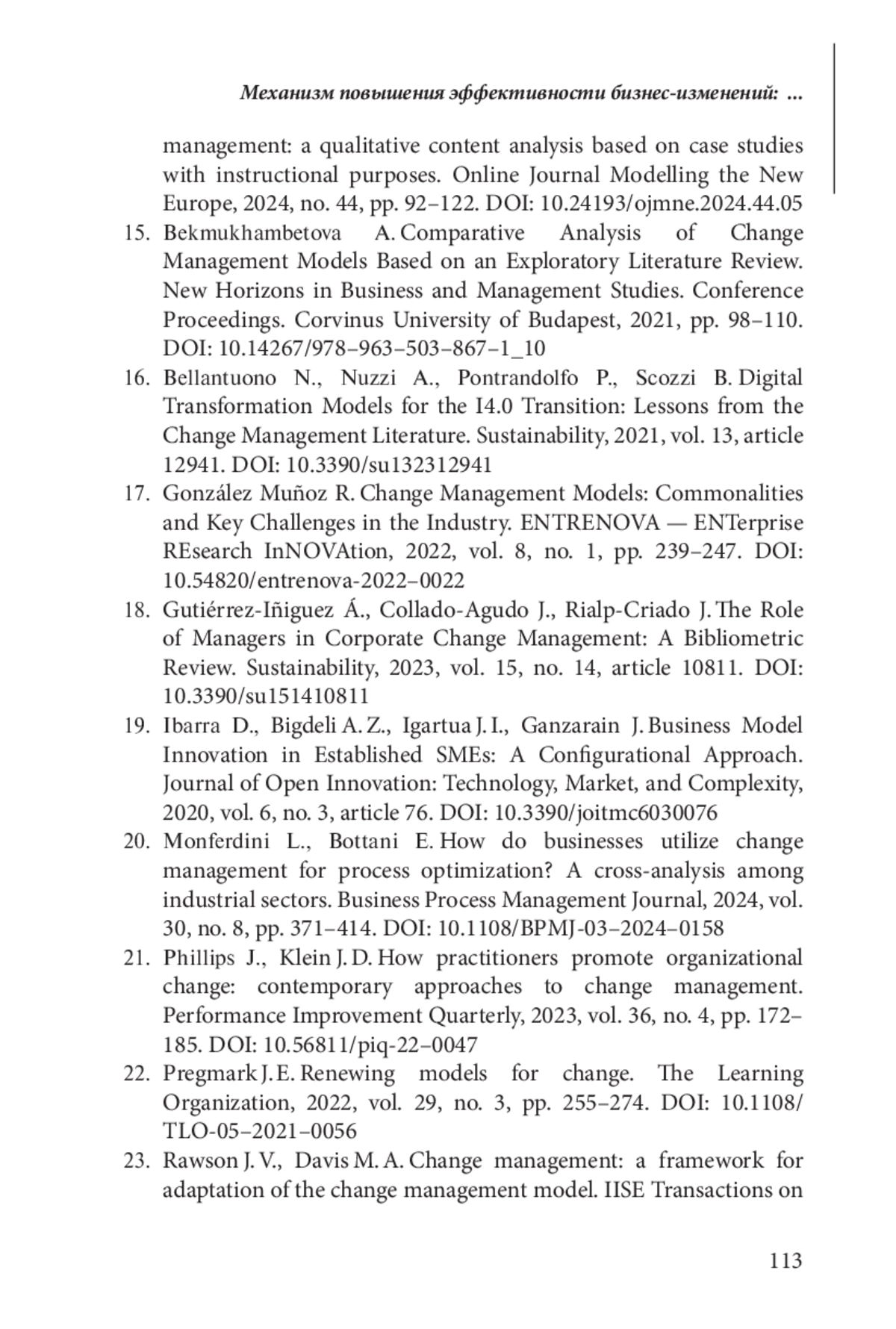 15. 	Bekmukhambetova A.Comparative Analysis of Change Management Models Based on an Exploratory Literature Review // New Horizons in Business and Management Studies. Conference Proceedings. Corvinus University of Budapest. 2021. P. 98-110. DOI: 10.14267/978-963-503-867-1_10