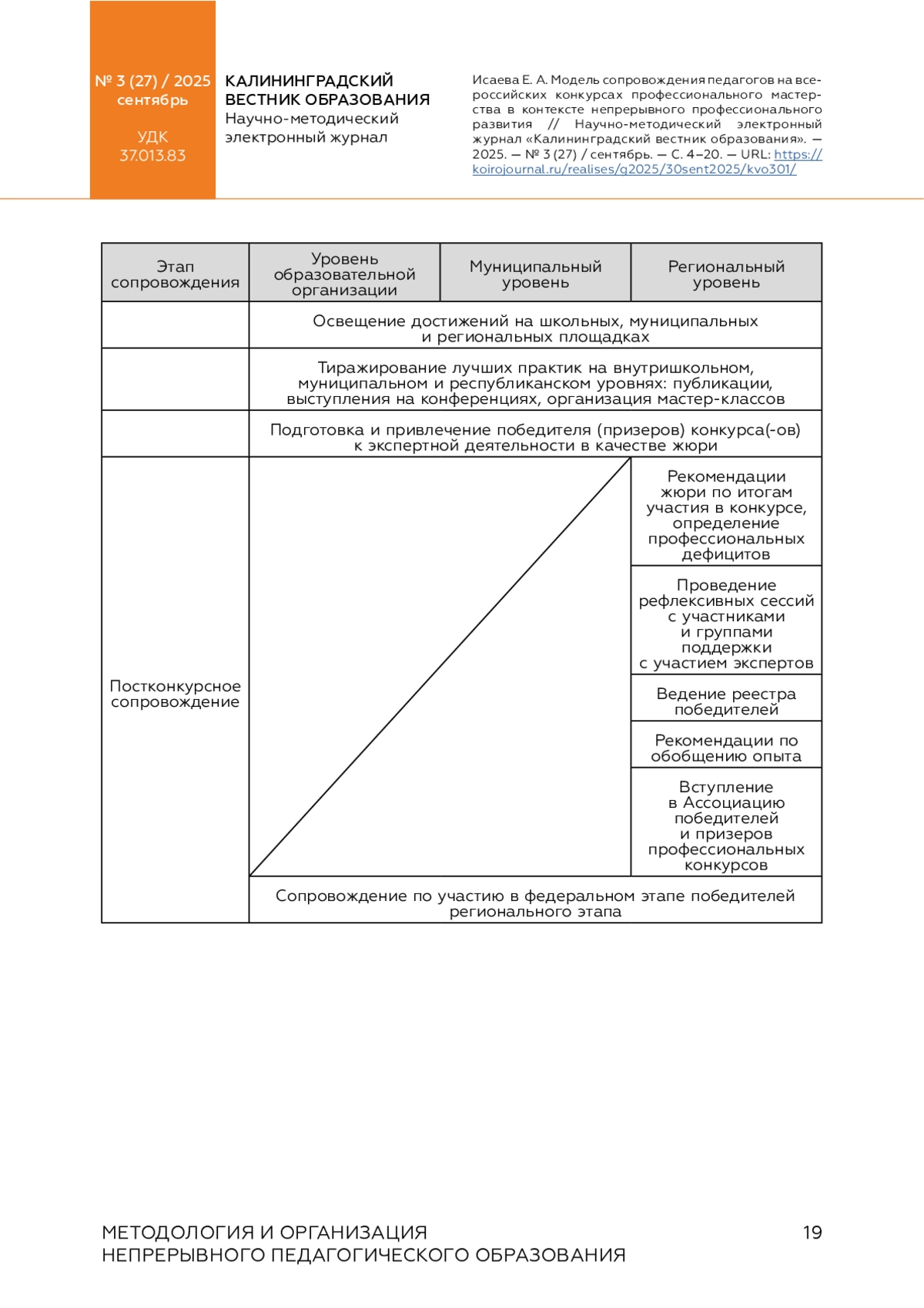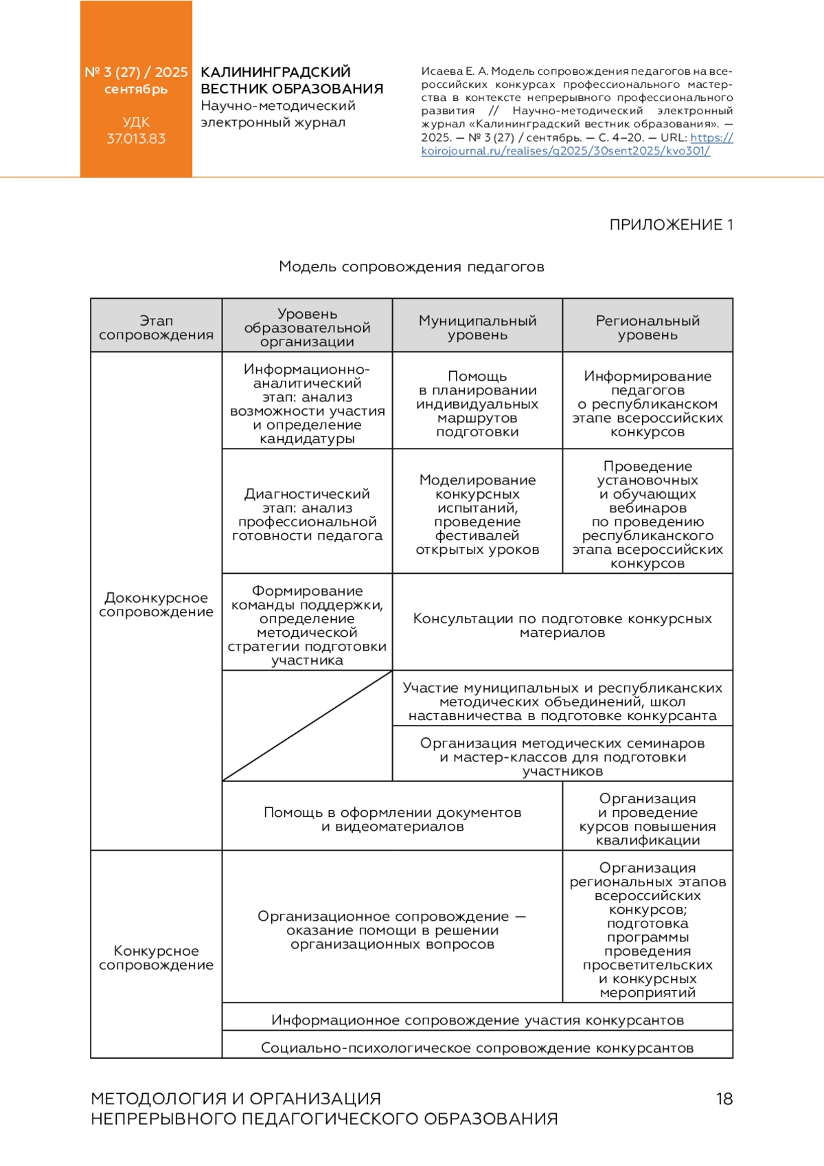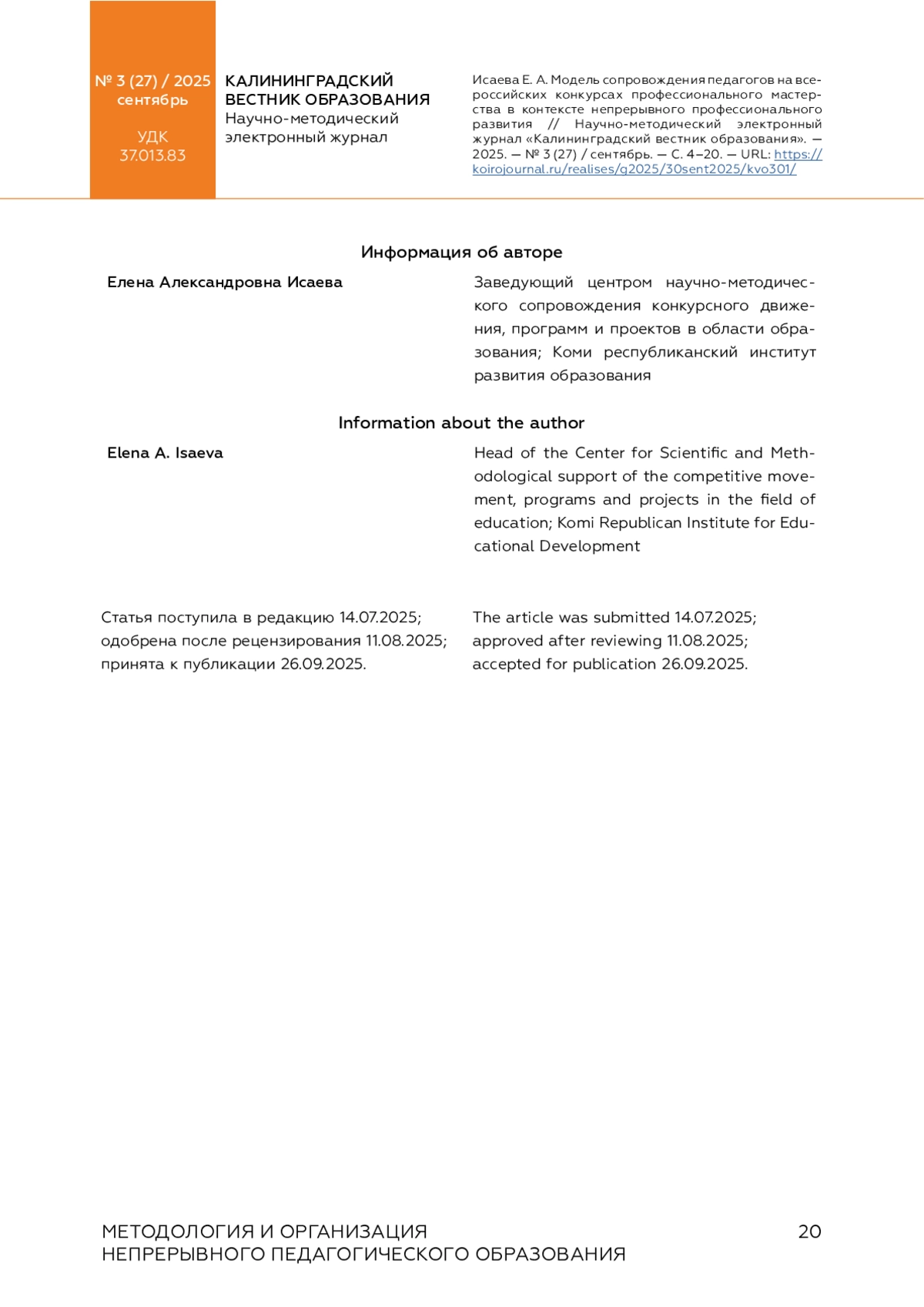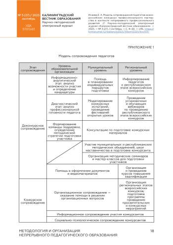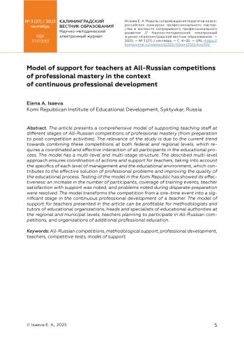 В статье представлена комплексная модель сопровождения педагогических работников на различных этапах всероссийских конкурсов профессионального мастерства (от подготовки до постконкурсной деятельности). Актуальность исследования обусловлена современной тенденцией к объединению данных конкурсов как на федеральном, так и на региональном уровне, что требует согласованного и эффективного взаимодействия всех участников образовательного процесса. Модель имеет многоуровневую и многоэтапную структуру. Описанный многоуровневый подход обеспечивает координацию действий и поддержку педагогов с учетом специфики каждого уровня управления и образовательной среды, что способствует эффективному решению профессиональных задач и повышению качества образовательного процесса. Апробация модели в Республике Коми показала ее эффективность: отмечен рост числа участников, охваченных обучающими мероприятиями, удовлетворенности педагогов поддержкой, устранены проблемы, отмеченные при разрозненной подготовке. Модель трансформирует конкурс из разового события в значимый этап непрерывного профессионального развития педагога. Представленная в статье модель сопровождения педагогов может быть полезна методистам и тьюторам образовательных организаций, руководителям и специалистам органов управления образованием на региональном и муниципальных уровнях, педагогам, планирующим участие во всероссийских конкурсах, организациям дополнительного профессионального образования.