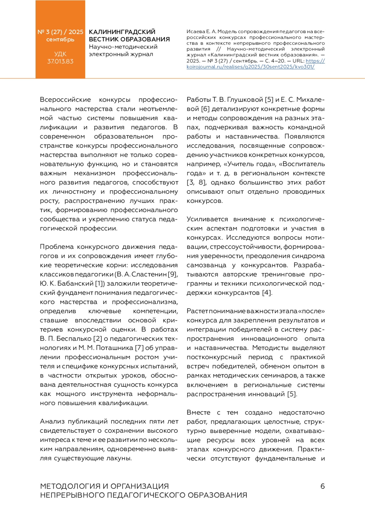 6. 	Михалева, Е. С. Конкурсное движение как одно из направлений повышения профессионального мастерства педагогических работников [Электронный ресурс] / Е. С. Михалева // Информационно-методический журнал «Про_ДОД». - 2022. - № 5 (41). - С. 40-51. - URL: https://prodod.moscow/wp-content/uploads/Pro_DOD_October_2022_new_5-1.pdf (дата обращения: 24.06.2025).