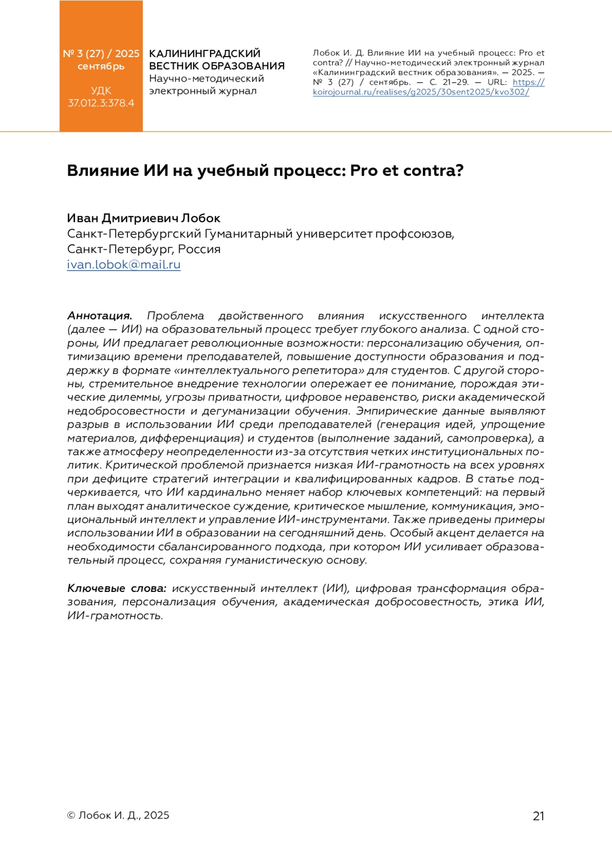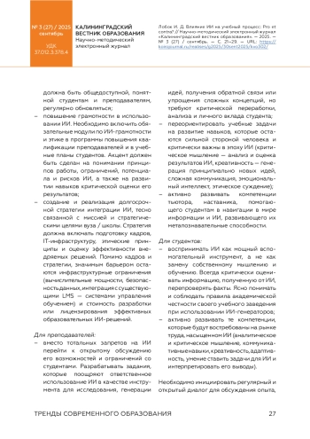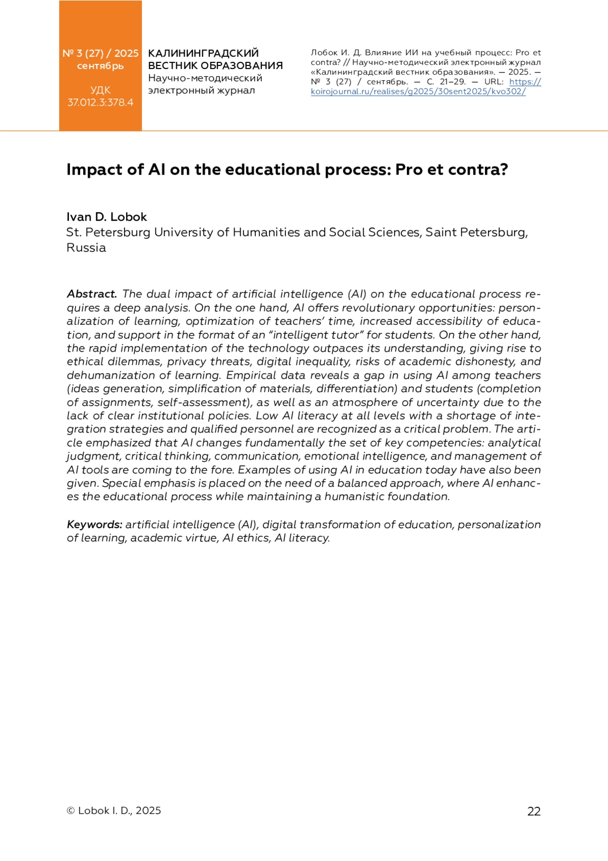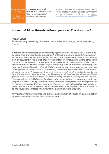 Проблема двойственного влияния искусственного интеллекта (далее — ИИ) на образовательный процесс требует глубокого анализа. С одной стороны, ИИ предлагает революционные возможности: персонализацию обучения, оптимизацию времени преподавателей, повышение доступности образования и поддержку в формате «интеллектуального репетитора» для студентов. С другой стороны, стремительное внедрение технологии опережает ее понимание, порождая этические дилеммы, угрозы приватности, цифровое неравенство, риски академической недобросовестности и дегуманизации обучения. Эмпирические данные выявляют разрыв в использовании ИИ среди преподавателей (генерация идей, упрощение материалов, дифференциация) и студентов (выполнение заданий, самопроверка), а также атмосферу неопределенности из-за отсутствия четких институциональных политик. Критической проблемой признается низкая ИИ-грамотность на всех уровнях при дефиците стратегий интеграции и квалифицированных кадров. В статье подчеркивается, что ИИ кардинально меняет набор ключевых компетенций: на первый план выходят аналитическое суждение, критическое мышление, коммуникация, эмоциональный интеллект и управление ИИ-инструментами. Также приведены примеры использовании ИИ в образовании на сегодняшний день. Особый акцент делается на необходимости сбалансированного подхода, при котором ИИ усиливает образовательный процесс, сохраняя гуманистическую основу.