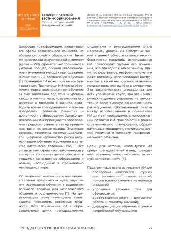 Цифровая трансформация, охватившая все сферы современного общества, не обошла стороной и образование. Такие технологии, как искусственный интеллект (далее — ИИ), стремительно проникают в учебный процесс, обещая революционные изменения в методах преподавания, оценке знаний и организации обучения [2]. Потенциал ИИ может показаться безграничным. При помощи ИИ можно обеспечить персонализированное обучение за счет адаптации под темп и уровень каждого ученика на основе анализа его действий и пробелов в знаниях, освободить время преподавателей и помочь преодолеть проблемы равенства и доступности в образовании. Однако для реализации этих преимуществ образованию предстоит ответить как на привычные, так и на новые вызовы. Этические вопросы, проблемы конфиденциальности, цифровое неравенство, риски дегуманизации обучения и сомнения в качестве материалов, созданных ИИ, — все это вызывает серьезную озабоченность у экспертов. Их главная цель — обеспечить учащимся качественное образование и навыки, необходимые в стремительно меняющемся мире.