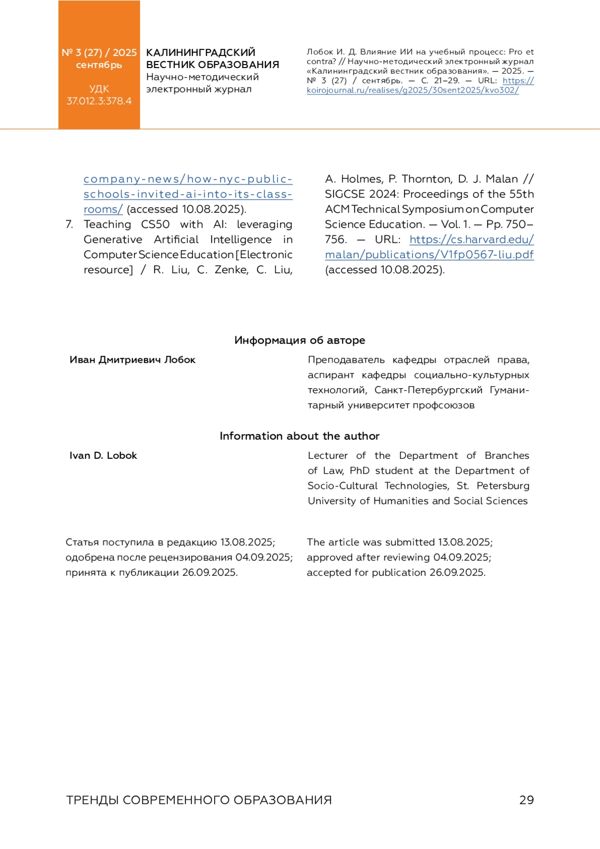7. 	Teaching CS50 with AI: leveraging Generative Artificial Intelligence in Computer Science Education [Electronic resource] / R. Liu, C. Zenke, C. Liu, A. Holmes, P. Thornton, D. J. Malan // SIGCSE 2024: Proceedings of the 55th ACM Technical Symposium on Computer Science Education. - Vol. 1. - Pp. 750-756. - URL: https://cs.harvard.edu/malan/publications/V1fp0567-liu.pdf (accessed 10.08.2025).