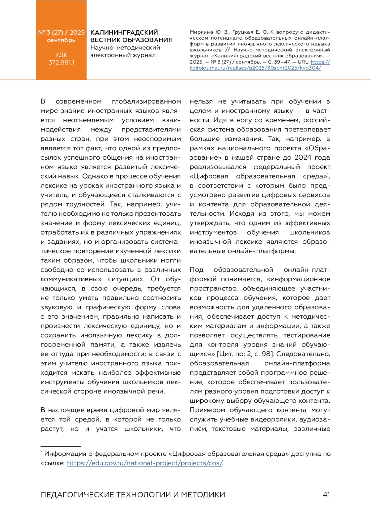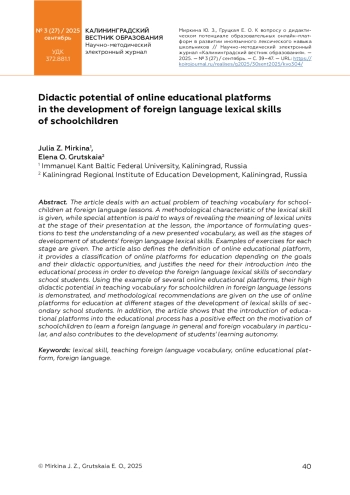 В статье рассматривается актуальная проблема обучения школьников лексике на уроках иностранного языка. Представлена методическая характеристика лексического навыка, при этом особое внимание уделяется способам раскрытия значения лексических единиц на стадии их презентации на уроке, важности формулировки вопросов на проверку понимания новой презентованной лексики, а также этапам развития иноязычного лексического навыка обучающихся; перечислены примеры упражнений для каждого этапа. В статье также дается определение образовательной онлайн-платформы, приводится классификация образовательных онлайн-платформ в зависимости от их целей и дидактических возможностей, обосновывается необходимость их внедрения в учебный процесс с целью развития иноязычного лексического навыка обучающихся средней школы. На примере нескольких образовательных онлайн-платформ демонстрируется их высокий дидактический потенциал в обучении школьников лексике на уроках иностранного языка, даются методические рекомендации по использованию онлайн-платформ для образования на разных этапах развития лексического навыка обучающихся средней школы. Кроме того, в статье продемонстрировано, что внедрение образовательных платформ в учебный процесс положительно влияет на мотивацию школьников к изучению иностранного языка в целом и иноязычной лексики — в частности, а также способствует развитию учебной автономии обучающихся.