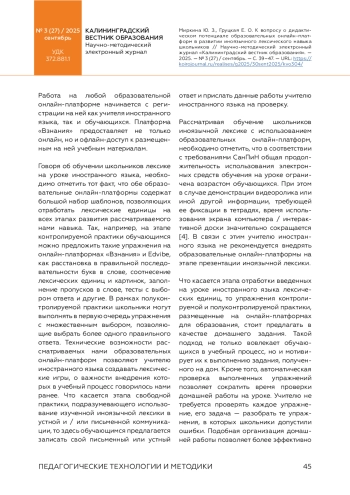 5. 	Титова, С. В. Рефлексия в онлайн-обучении иностранным языкам в школе: подходы, способы, механизмы реализации / С. В. Титова, К. В. Баринова // Иностранные языки в школе. - 2020. - № 9. - С. 29-37.