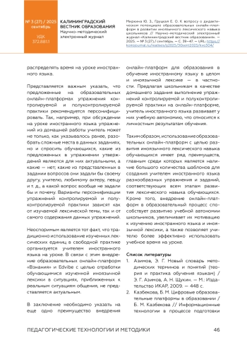 2. 	Казбекова, Б. М. Цифровые образовательные платформы в образовании / Б. М. Казбекова // Информационные технологии в процессе подготовки современного специалиста: Межвузовский сборник научных трудов. - Липецк: ЛГПУ им. П. П. Семенова-Тян-Шанского, 2022. - Вып. 26. - С. 97-102.