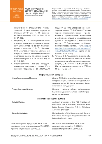 3. 	Миркина, Ю. З. Формирование иноязычных лексических навыков младших школьников на основе полисенсорного подхода / Ю. З. Миркина, П. В. Енкулева // Известия Балтийской государственной академии рыбопромыслового флота: психолого-педагогические науки. - 2024. - № 3 (69). - С. 154-158.