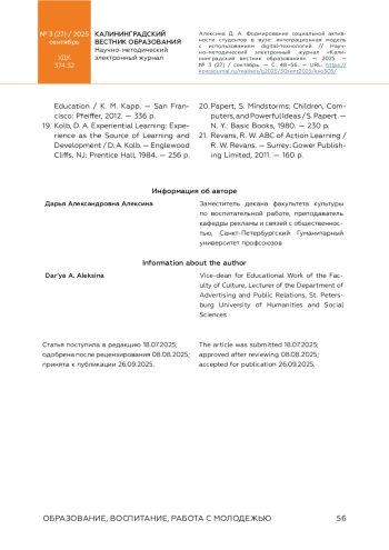19. Kolb, D. A. Experiential Learning: Experience as the Source of Learning and Development / D. A. Kolb. - Englewood Cliffs, NJ: Prentice Hall, 1984. - 256 p.