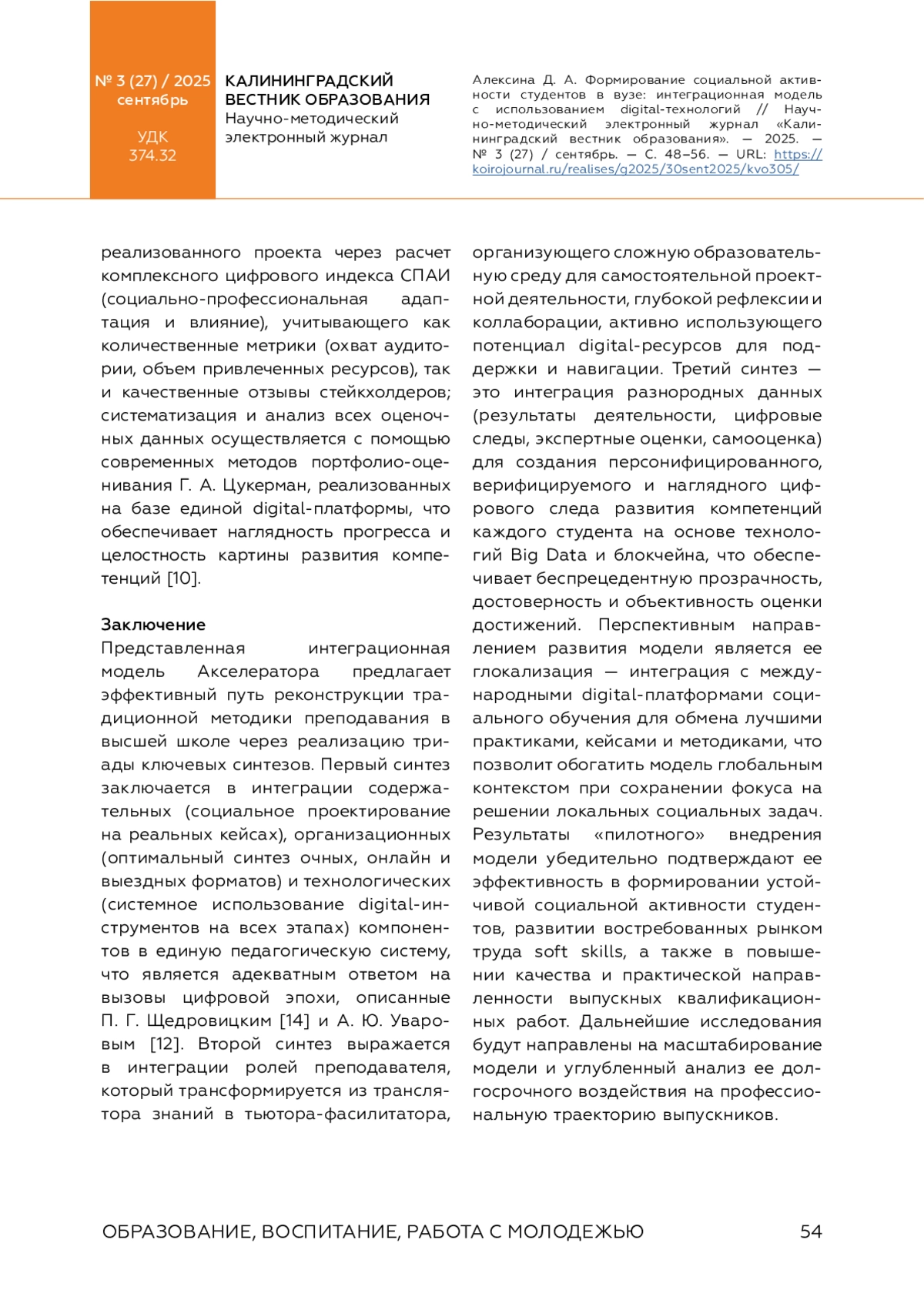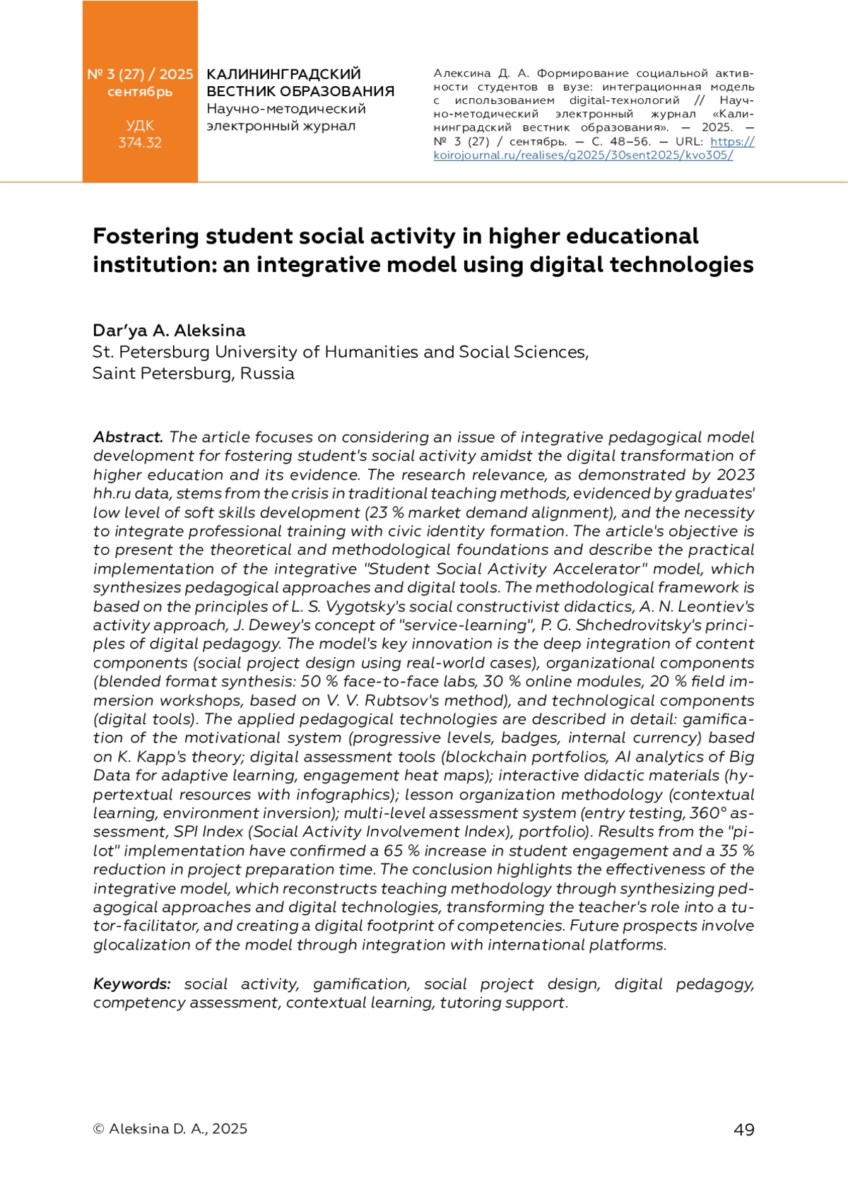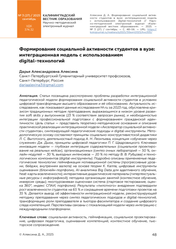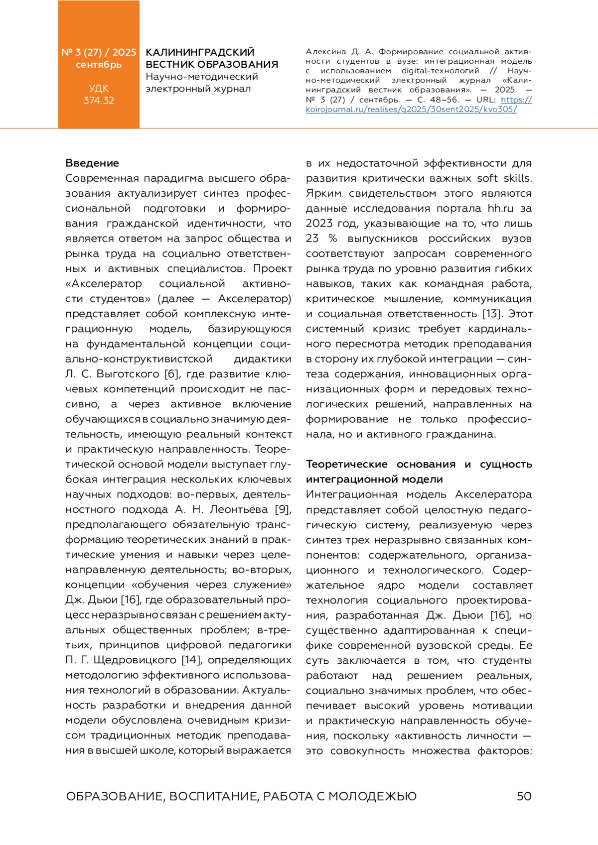 Статья посвящена рассмотрению проблемы разработки интеграционной педагогической модели формирования социальной активности студентов в условиях цифровой трансформации высшего образования и её обоснованию. Актуальность исследования, как показывают данные исследования hh. ru за 2023 год, обусловлена кризисом традиционных методик преподавания, выражающимся в низком уровне развития soft skills у выпускников (23 % соответствия запросам рынка), и необходимостью интеграции профессиональной подготовки с формированием гражданской идентичности. Цель статьи — представить теоретико-методические основания и описание практической реализации интеграционной модели «Акселератор социальной активности студентов», синтезирующей педагогические подходы и digital-инструменты. Методологическую основу составляют принципы социально-конструктивистской дидактики Л. С. Выготского, деятельностный подход А. Н. Леонтьева, концепция «обучения через служение» Дж. Дьюи, принципы цифровой педагогики П. Г. Щедровицкого. Ключевая инновация модели — глубокая интеграция содержательных (социальное проектирование на реальных кейсах), организационных (синтез очных лабораторий — 50 %, онлайн-модулей — 30 %, выездных интенсивов — 20 % по методу В. В. Рубцова) и технологических компонентов (digital-инструменты). Подробно описаны применяемые педагогические технологии: геймификация мотивационной системы (прогрессивные уровни, бейджи, внутренняя валюта) на основе теории К. Каппа; цифровые инструменты оценивания (блокчейн-портфолио, AI-аналитика Big Data для адаптивного обучения, heat-карты вовлеченности); интерактивные дидактические материалы (гипертекстуальные ресурсы с инфографикой); методика организации занятий (контекстное обучение, инверсия среды); многоуровневая оценочная система (стартовое тестирование, оценка 360°, индекс СПАИ, портфолио). Результаты «пилотного» внедрения подтвердили рост вовлеченности студентов на 65 % и сокращение времени подготовки проектов на 35 %. Делается вывод об эффективности интеграционной модели, реконструирующей методику преподавания через синтез педагогических подходов и digital-технологий, трансформацию роли преподавателя в тьютора-фасилитатора и создание цифрового следа компетенций. Перспективы связаны с глокализацией модели через интеграцию с международными платформами.