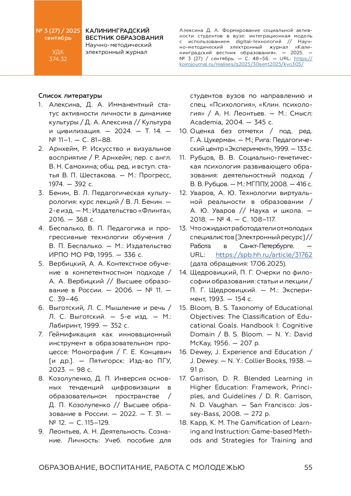 8. Козолупенко, Д. П. Инверсия основных тенденций цифровизации в образовательном пространстве / Д. П. Козолупенко // Высшее образование в России. - 2022. - Т. 31. - № 12. - С. 115-129.
