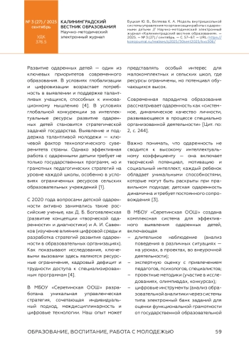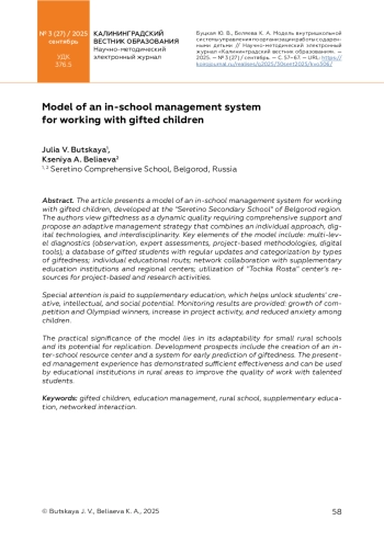 В статье представлена модель внутришкольной системы управления работой с одаренными детьми, разработанная в МБОУ «Серетинская ООШ» Белгородской области. Авторы рассматривают одаренность как динамическое качество, требующее комплексного сопровождения, и предлагают адаптивную управленческую стратегию, сочетающую индивидуальный подход, цифровые технологии и междисциплинарность. Ключевые элементы модели включают многоуровневую диагностику (наблюдение, экспертные оценки, проектные методики, цифровые инструменты); банк данных одаренных учащихся с регулярным обновлением и структурированием по видам одаренности; индивидуальные образовательные маршруты; сетевое взаимодействие с учреждениями дополнительного образования и региональными центрами; использование ресурсов центра «Точка роста» для проектно-исследовательской деятельности.