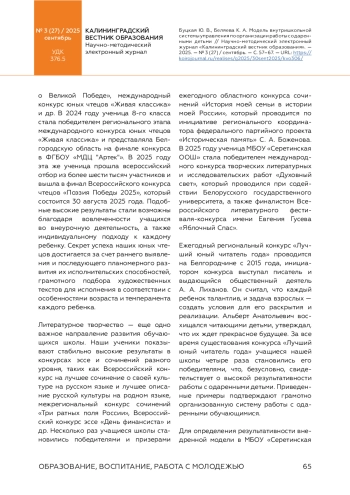 Практическая значимость модели заключается в ее адаптивности для малокомплектных сельских школ и возможности тиражирования. Перспективы развития включают создание межшкольного ресурсного центра и систему раннего прогнозирования одаренности. Представленный управленческий опыт показал достаточную эффективность и может быть использован образовательными учреждениями сельской местности для повышения качества работы с талантливыми обучающимися.