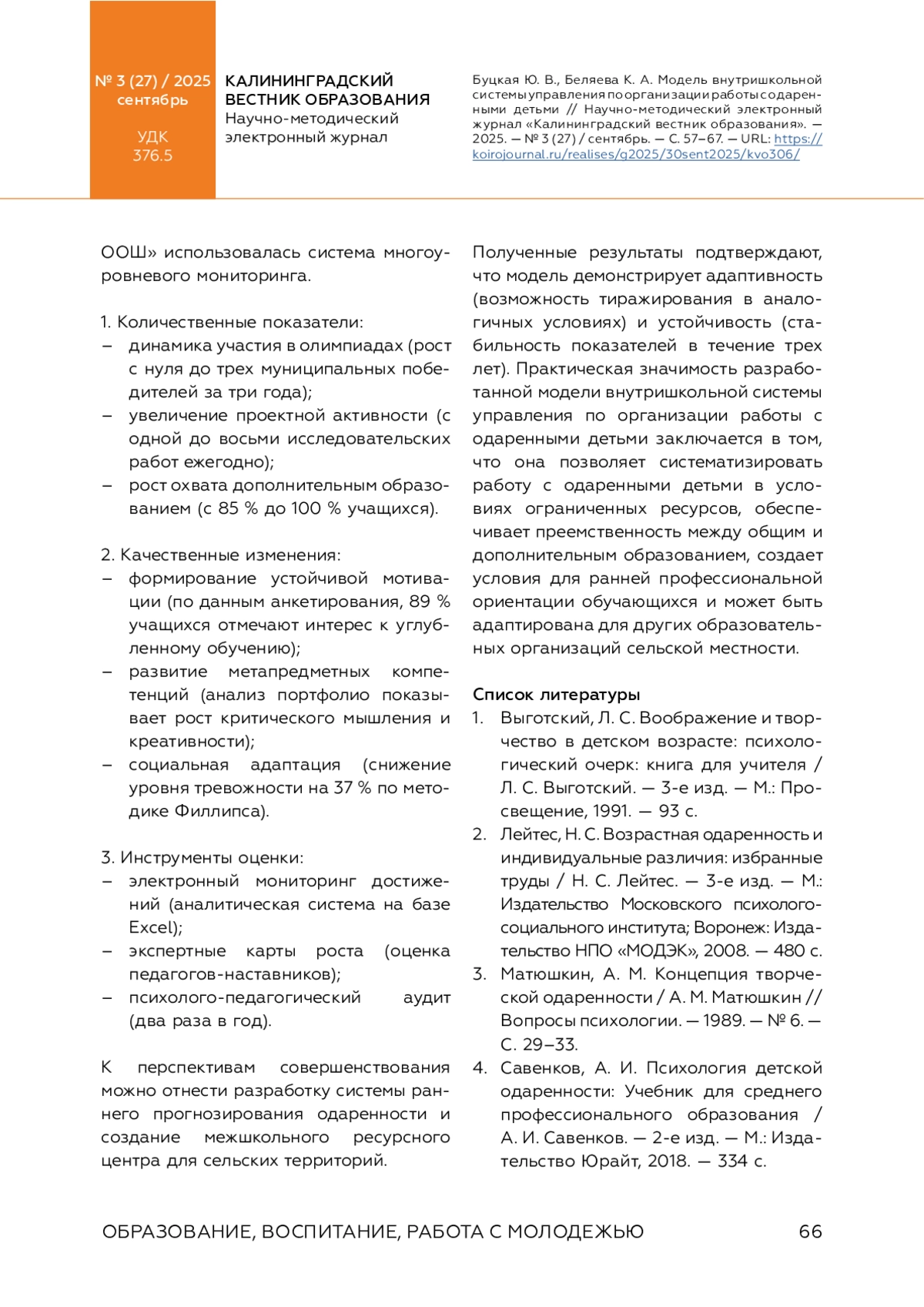 3. Матюшкин, А. М. Концепция творческой одаренности / А. М. Матюшкин // Вопросы психологии. - 1989. - № 6. - С. 29-33.