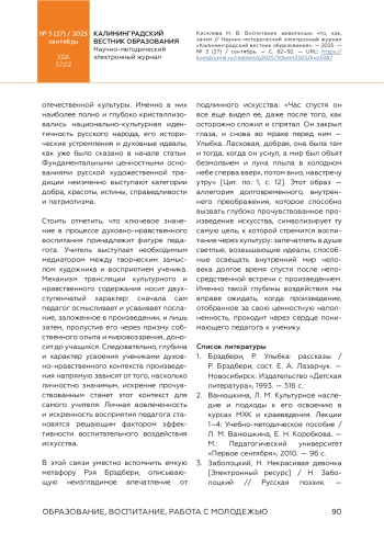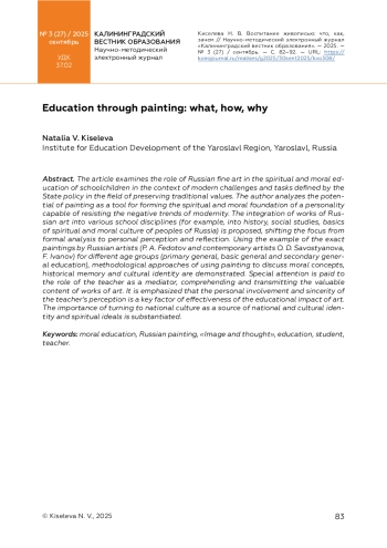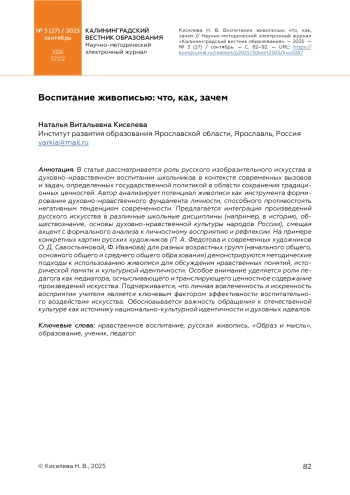 В статье рассматривается роль русского изобразительного искусства в духовно-нравственном воспитании школьников в контексте современных вызовов и задач, определенных государственной политикой в области сохранения традиционных ценностей. Автор анализирует потенциал живописи как инструмента формирования духовно-нравственного фундамента личности, способного противостоять негативным тенденциям современности. Предлагается интеграция произведений русского искусства в различные школьные дисциплины (например, в историю, обществознание, основы духовно-нравственной культуры народов России), смещая акцент с формального анализа к личностному восприятию и рефлексии. На примере конкретных картин русских художников (П. А. Федотова и современных художников О. Д. Савостьяновой, Ф. Иванова) для разных возрастных групп (начального общего, основного общего и среднего общего образования) демонстрируются методические подходы к использованию живописи для обсуждения нравственных понятий, исторической памяти и культурной идентичности. Особое внимание уделяется роли педагога как медиатора, осмысливающего и транслирующего ценностное содержание произведений искусства. Подчеркивается, что личная вовлеченность и искренность восприятия учителя является ключевым фактором эффективности воспитательного воздействия искусства. Обосновывается важность обращения к отечественной культуре как источнику национально-культурной идентичности и духовных идеалов.