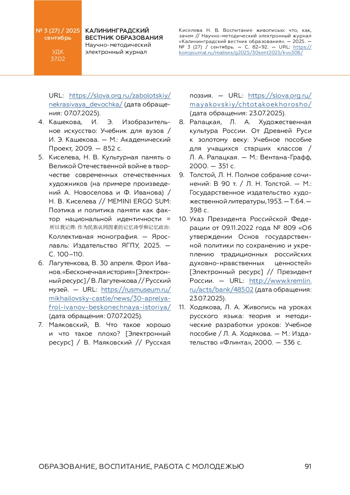5. 	Киселева, Н. В. Культурная память о Великой Отечественной войне в творчестве современных отечественных художников (на примере произведений А. Новоселова и Ф. Иванова) / Н. В. Киселева // MEMINI ERGO SUM: Поэтика и политика памяти как фактор национальной идентичности = 所以我记得: 作为民族认同因素的记忆诗学和记忆政治: Коллективная монография. - Ярославль: Издательство ЯГПУ, 2025. - С. 100-110.