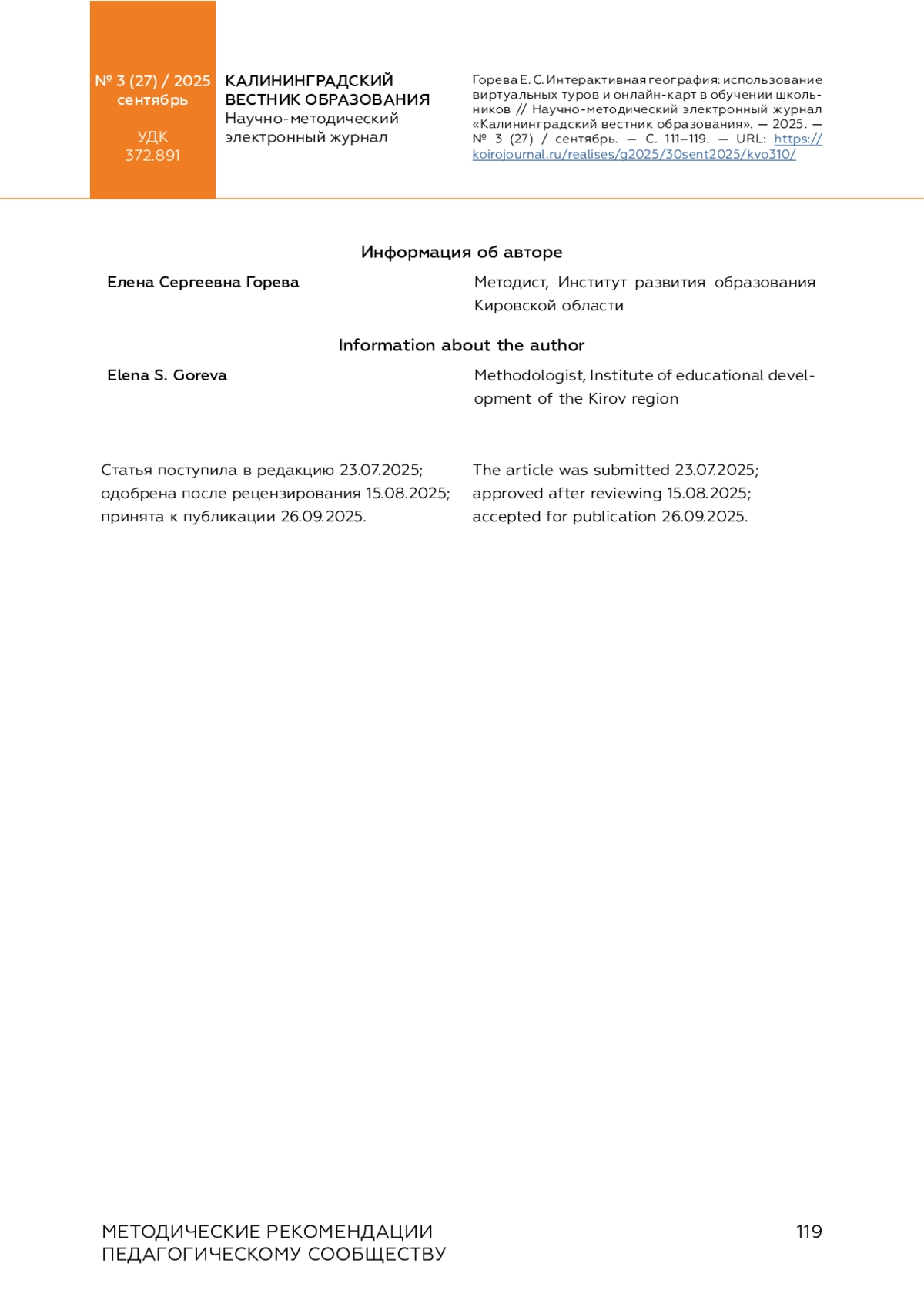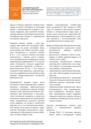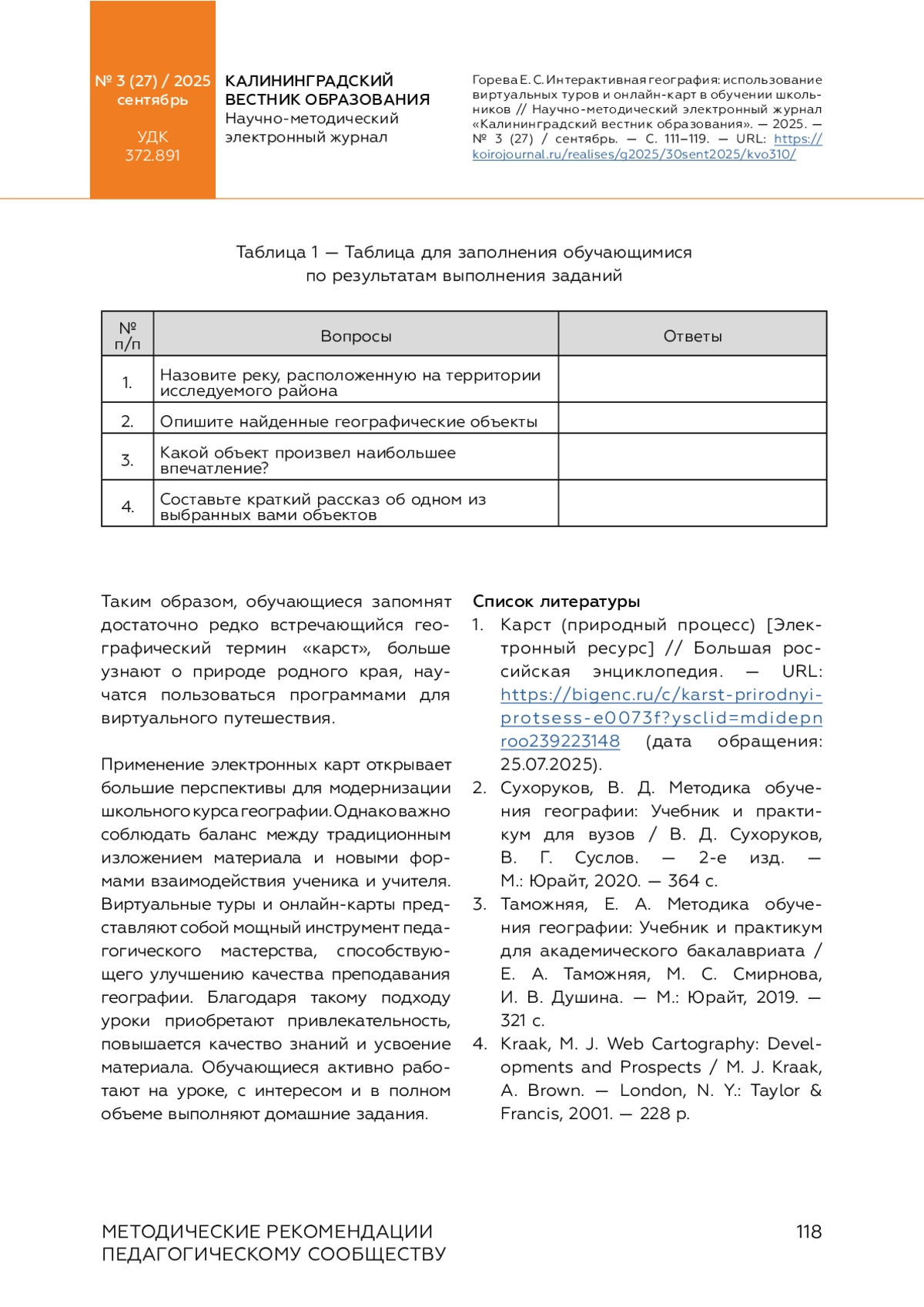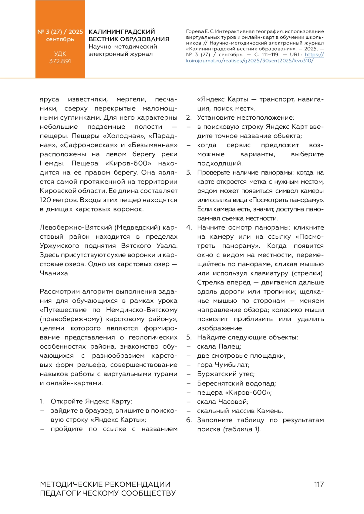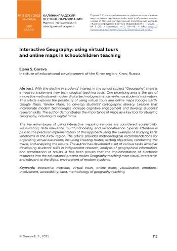 Рассмотрены главные преимущества применения интерактивных картографических сервисов: доступность, визуализация, актуальность данных, мультифункциональность и персонализация. Особое внимание уделено практической реализации данного подхода на примере изучения карстовых форм рельефа в Кировской области. В статье представлены методические рекомендации по организации виртуальных экскурсий, включая составление маршрутов, постановку задач, непосредственное путешествие, а также анализ полученных результатов. Автором разработан комплекс разнообразных заданий, направленных на развитие у обучающихся навыков самостоятельного исследования, анализа географической информации и представления результатов; при этом доказано, что внедрение электронных ресурсов в учебный процесс способствует более глубокому и осознанному усвоению материала, делает преподавание географии более наглядным, интерактивным и соответствующим цифровой среде современного школьника.