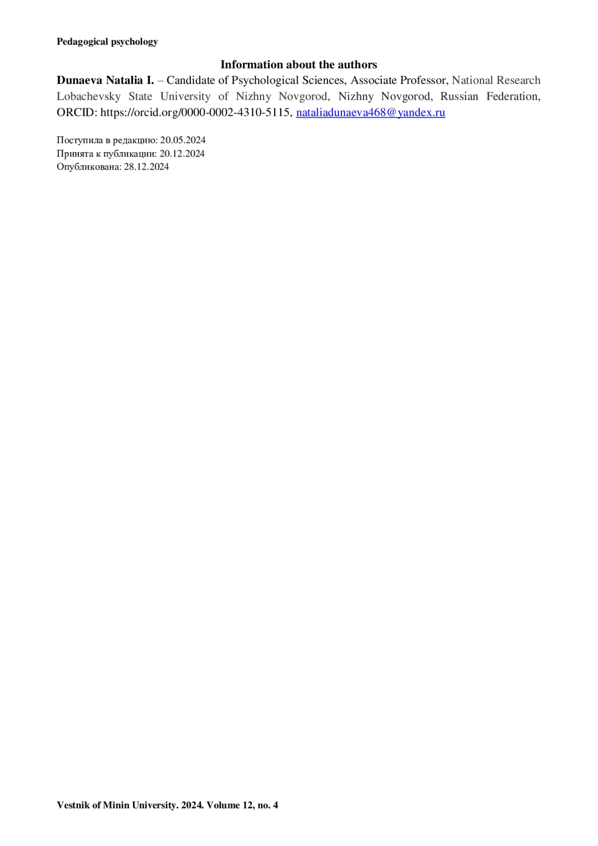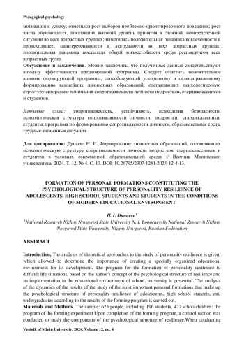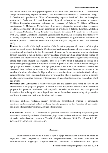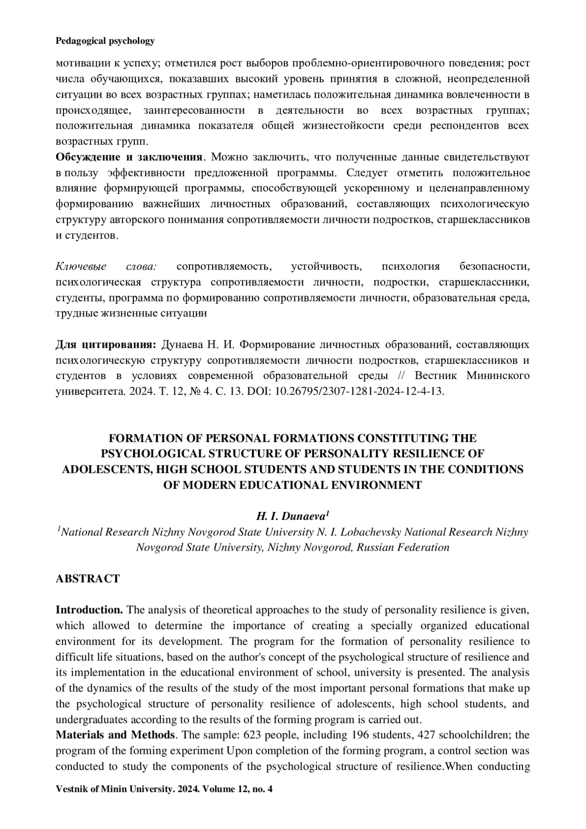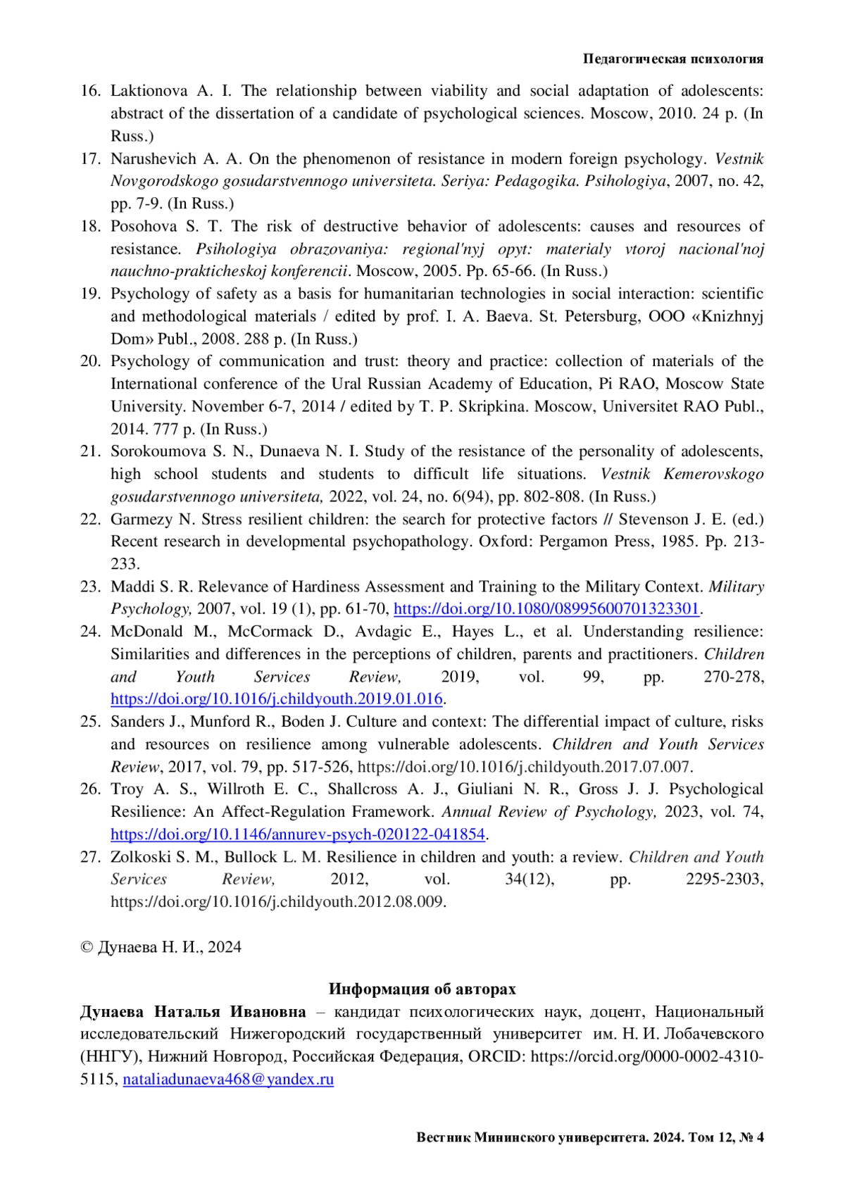 11. Дунаева Н. И., Сорокоумова С. Н. Психологическая структура сопротивляемости личности подростков, старшеклассников и студентов: основные эмпирические результаты // Вестник Санкт-Петербургского военного института войск национальной гвардии. 2024. № 1(26). С. 109-117.