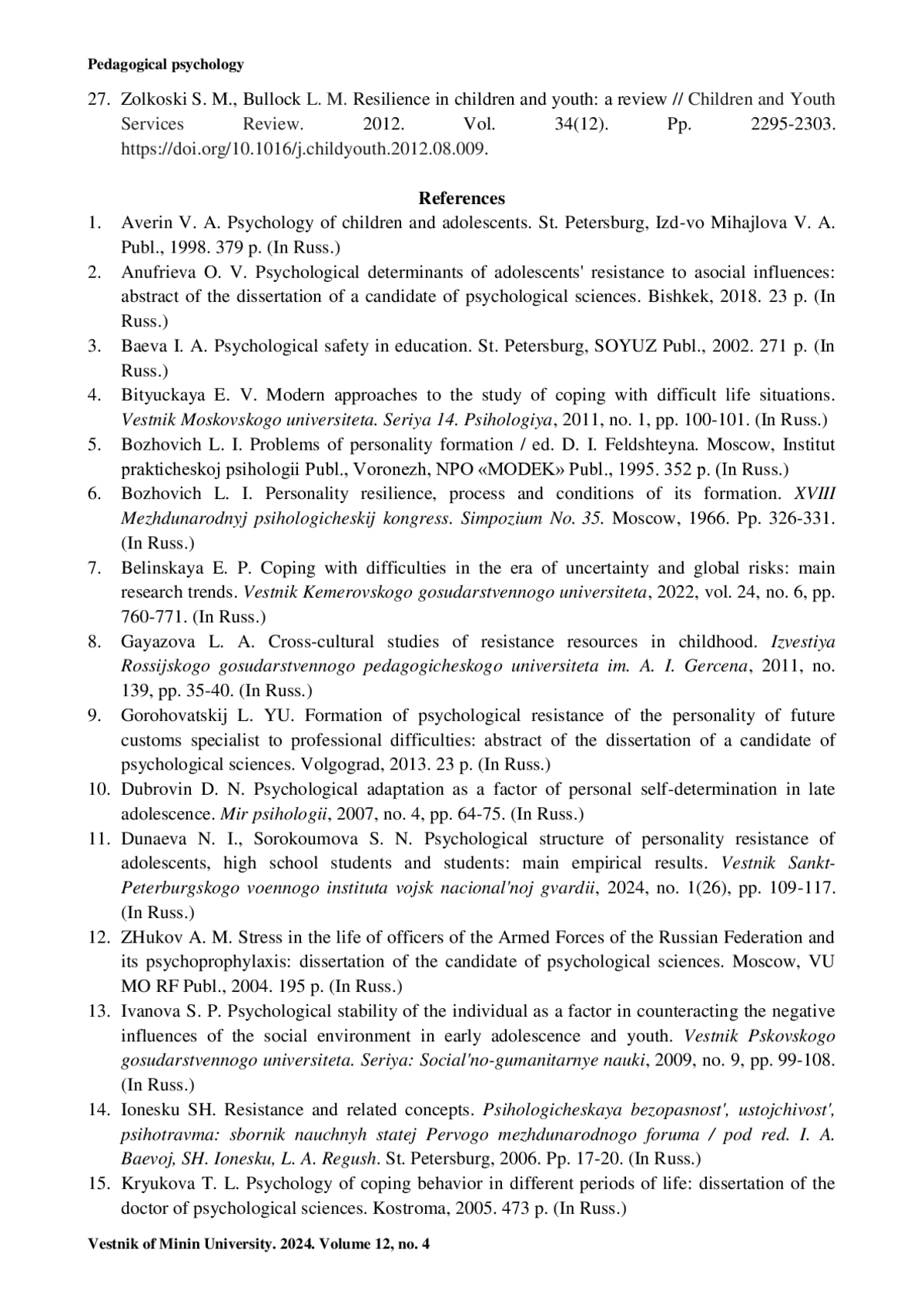 27. Zolkoski S. M., Bullock L. M. Resilience in children and youth: а review // Children and Youth Services Review. 2012. Vol. 34(12). Pp. 2295-2303. https://doi.org/10.1016/j.childyouth.2012.08.009.