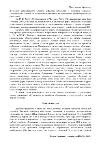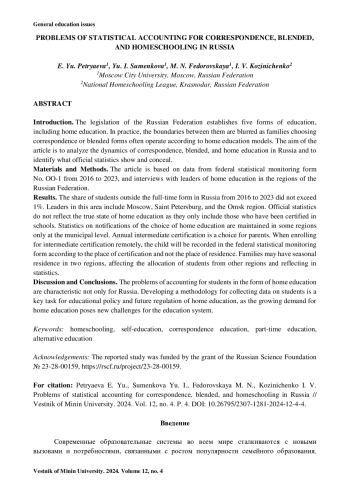 Введение. В законодательстве РФ закреплены пять форм обучения, включая семейное образование. На практике границы между ними размываются, так как семьи, выбирающие очно-заочную или заочную формы, часто действуют по моделям семейного образования. Цель статьи – проанализировать динамику очно-заочного, заочного и семейного образования в России и выявить, что показывает и что скрывает официальная статистика.