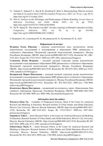 28. Lyubitskaya K., Polivanova K. Parental Engagement: Why Parents in Russia Choose Homeschooling and What Problems They Have to Solve // Journal of School Choice. 2022. Vol. 16, no. 2. Рp. 191-209. https://doi.org/10.1080/15582159.2021.2018785.