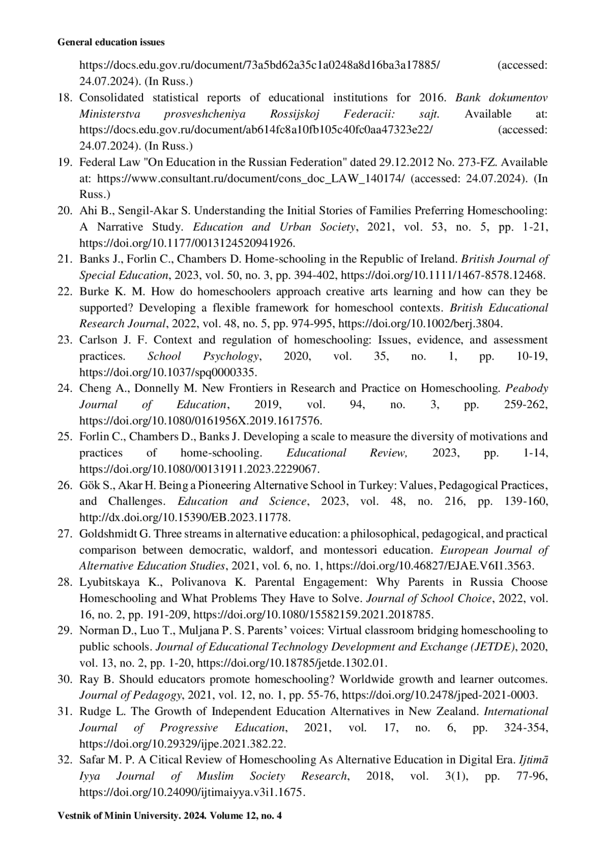 24. Cheng A., Donnelly M. New Frontiers in Research and Practice on Homeschooling // Peabody Journal of Education. 2019. Vol. 94, no. 3. Pp. 259-262. https://doi.org/10.1080/0161956X.2019.1617576.