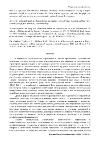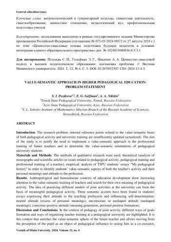 Введение. Проблема исследования: внутренние ориентиры, связанные с ценностносмысловыми основами как самой педагогической деятельности, так и вузовской подготовки к ней, недостаточно актуализированы. Цель исследования заключается в обосновании необходимости реализации ценностно-смыслового подхода в профессиональной подготовке будущих педагогов и определении ценностно-смысловых ориентиров студентов педагогического вуза.