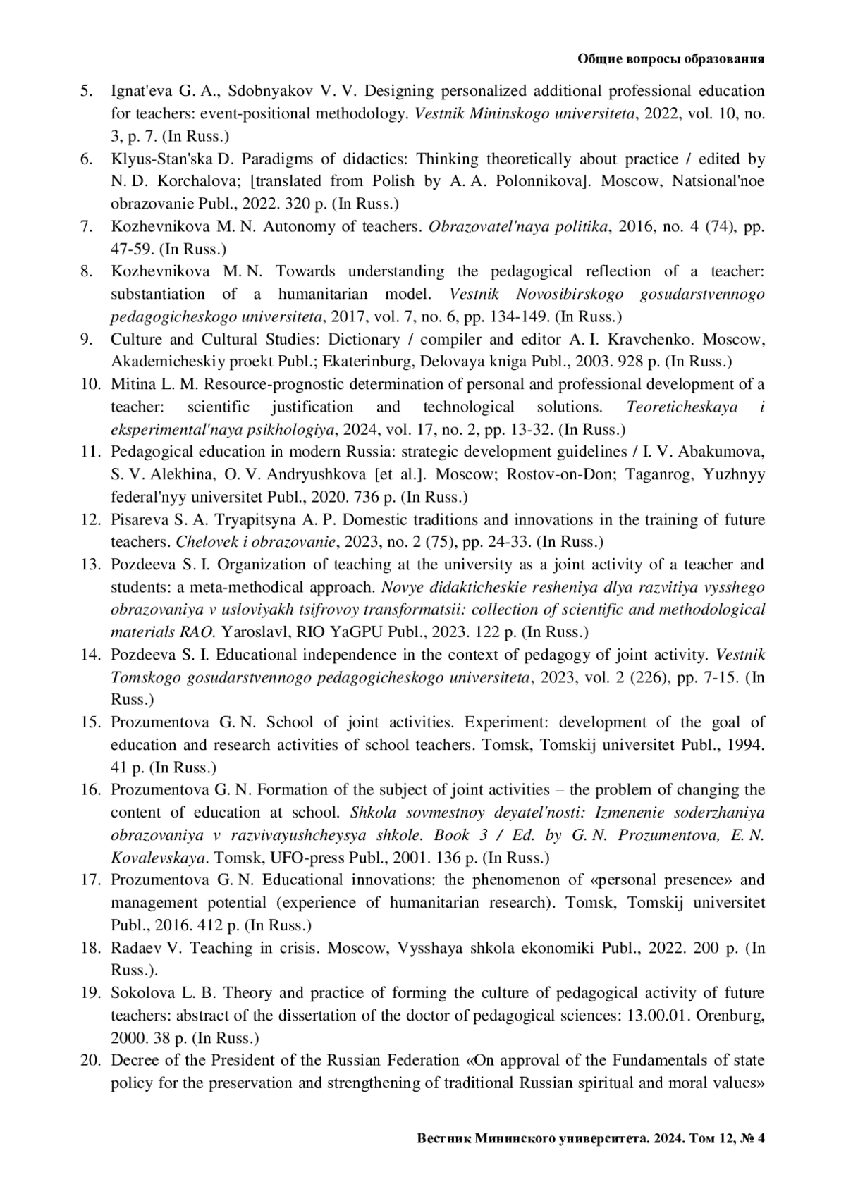 12. Писарева С. А. Тряпицына А. П. Отечественные традиции и инновации в подготовке будущих педагогов // Человек и образование. 2023. № 2 (75). С. 24-33.