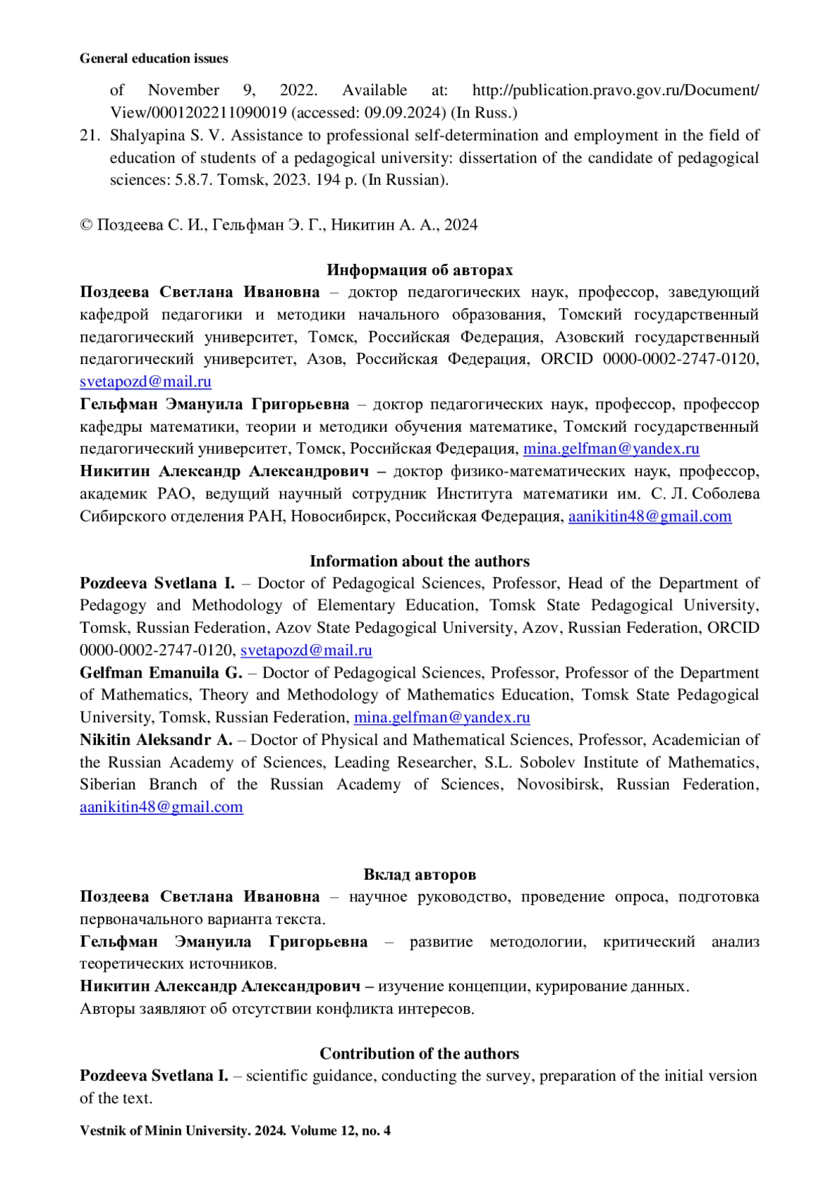 14. Поздеева С. И. Учебная самостоятельность в контексте педагогики совместной деятельности // Вестник Томского государственного педагогического университета (Tomsk State Pedagogical University Bulletin). 2023. Вып. 2 (226). С. 7-15.
