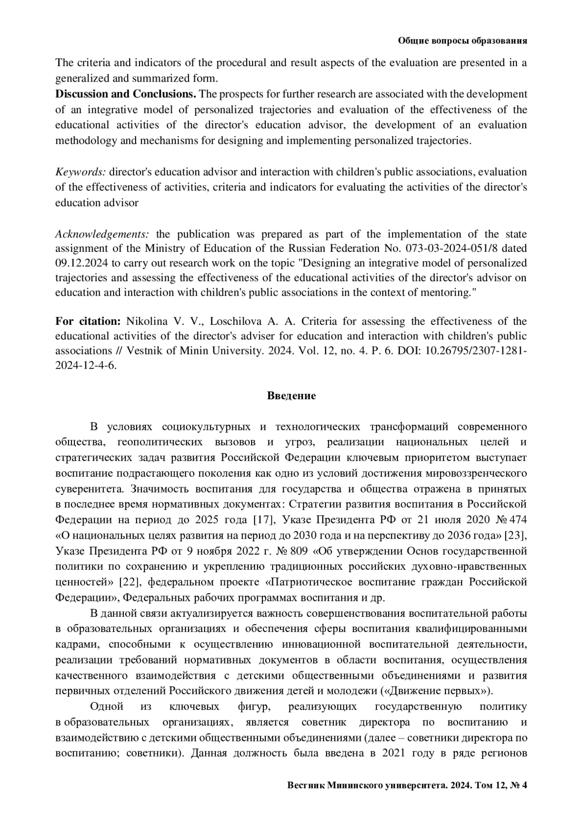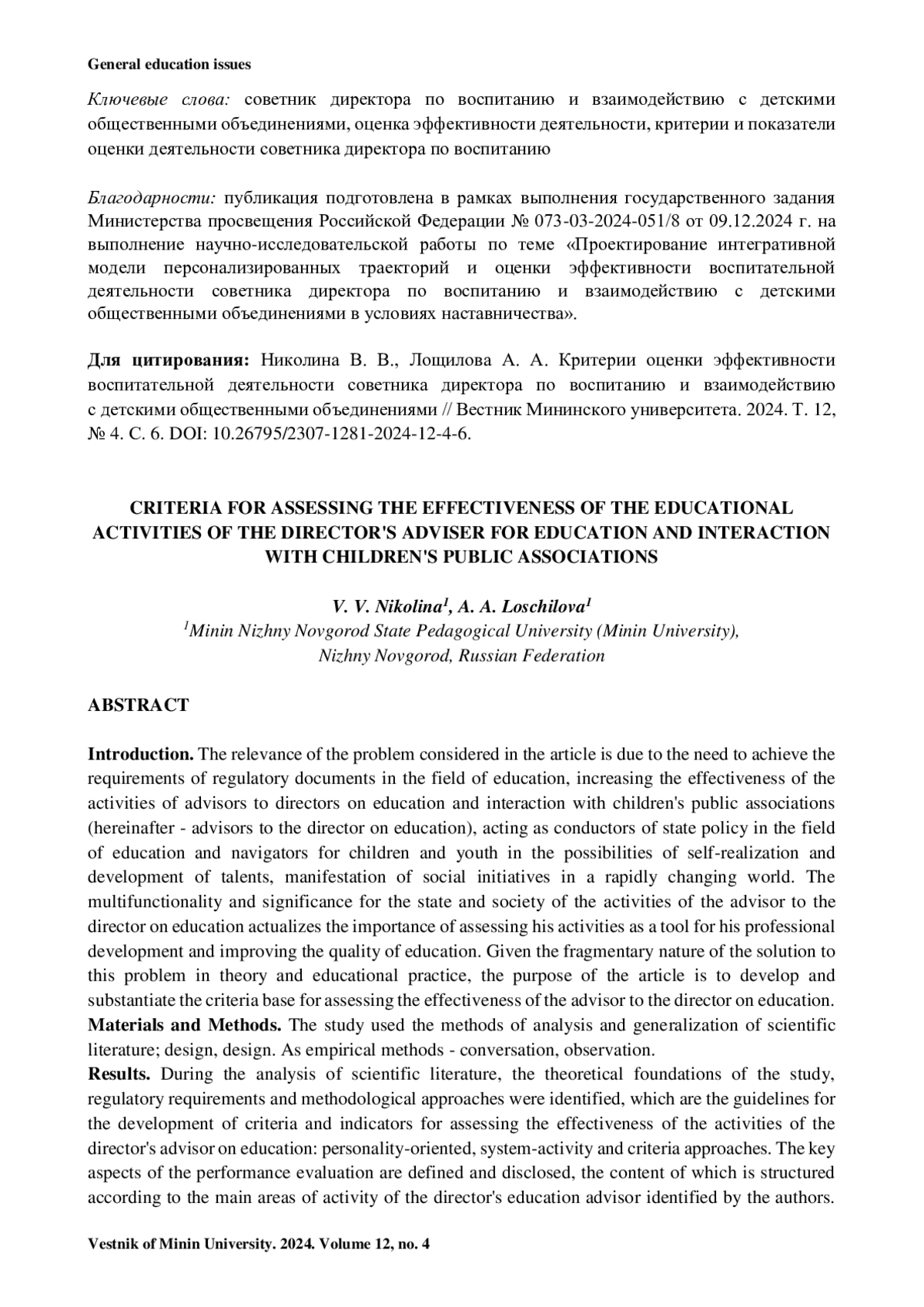 Введение. Актуальность рассматриваемой в статье проблемы обусловлена необходимостью достижения требований нормативных документов в области воспитания, повышением эффективности деятельности советников директоров по воспитанию и взаимодействию с детскими общественными объединениями (далее – советники директора по воспитанию), выступающими проводниками государственной политики в области воспитания и навигаторами для детей и молодежи в возможностях самореализации и развития талантов, проявления социальных инициатив в быстро меняющемся мире. Многофункциональность и значимость для государства и общества деятельности советника директора по воспитанию актуализирует важность оценки его деятельности как инструмента его профессионального развития и повышения качества воспитания. Учитывая фрагментарность решения данной проблемы в теории и образовательной практике, целью статьи является разработка и обоснование критериальной базы оценки эффективности деятельности советника директора по воспитанию.