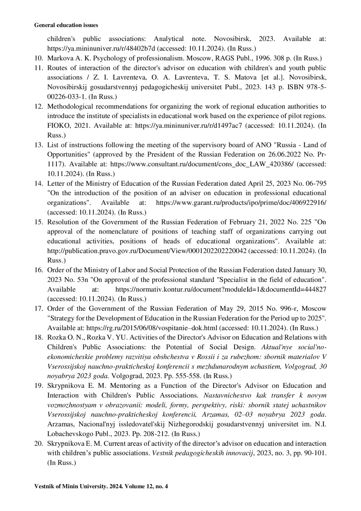 20. Скрыпникова Е. М. Актуальные направления деятельности советника директора по воспитанию и взаимодействию с детскими общественными объединениями // Вестник педагогических инноваций. 2023. № 3. С. 90-101.