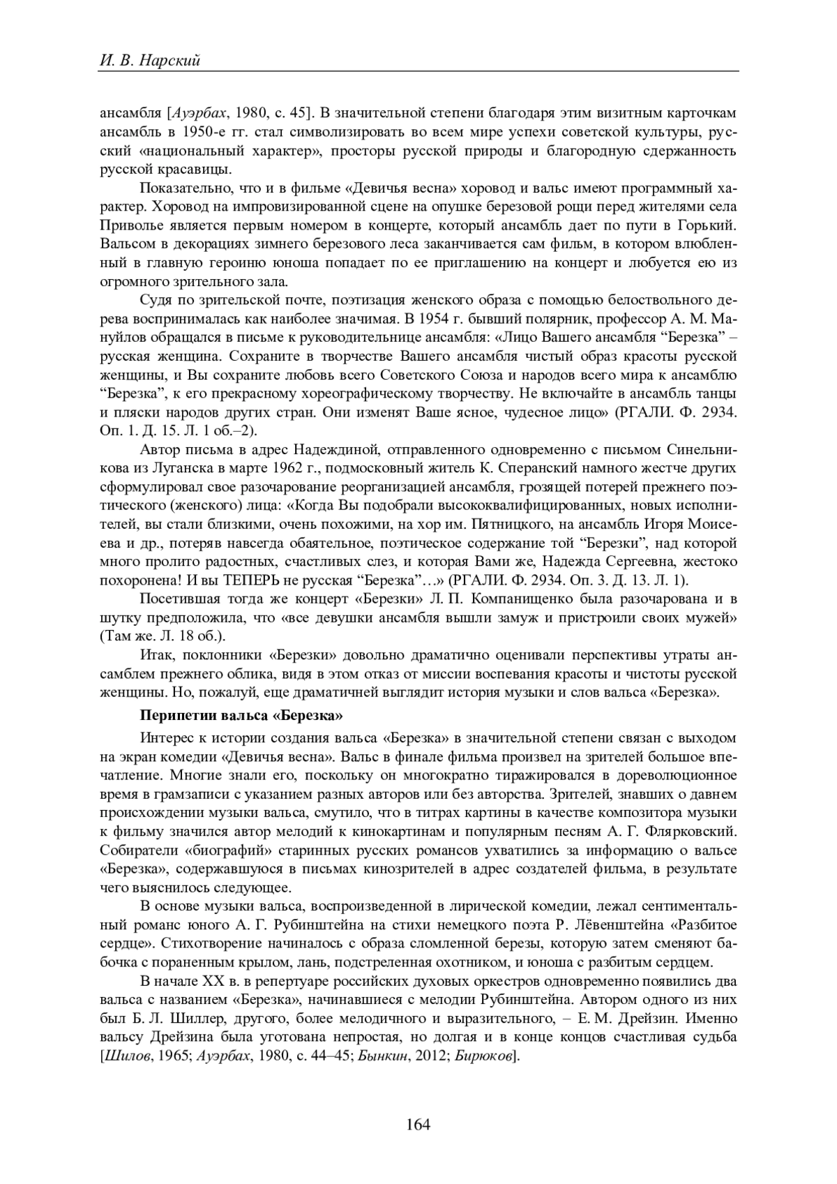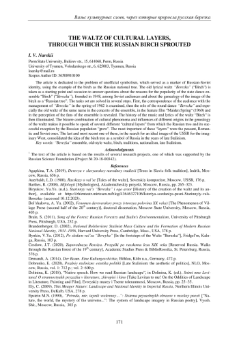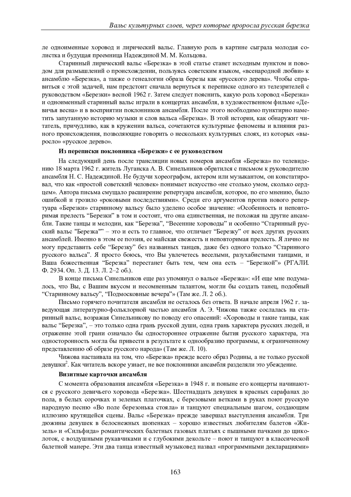 Статья посвящена проблеме неофициальной символики, служившей маркером русско-советской идентичности, на примере березы как национального русского дерева. Старинный лирический вальс «Березка» и одноименный хоровод в постановке Н. С. Надеждиной рассматриваются в качестве исходного пункта и повода для ответа на вопросы о причинах популярности у советской публики государственного танцевального ансамбля «Березка», основанного в 1948 г., а также о генеалогии образа березы как «русского дерева». Поставленные задачи решаются с помощью нескольких шагов. Вначале рассматривается переписка зрителей с руководством «Березки» весной 1962 г. Затем выявляется роль хоровода «Березка» и одноименного старинного вальса в концертах ансамбля, в художественном фильме «Девичья весна» и в восприятии поклонников ансамбля. После этого пунктирно излагается история музыки и слов вальса «Березка». Причудливое сочетание в генеалогии вальса культурных феноменов и влияний разного происхождения позволяет говорить о нескольких разновременных культурных слоях, на которых «взросли» «русское дерево» и его успешная рецепция российским населением. Важнейшими среди этих пластов были крестьянский (бытовой и религиозный), романтический и российско-советский. Причем последний и самый молодой из них в поисках идеального образа СССР для воображаемого Запада и закрепил в годы позднего сталинизма представление о березе как символе России. Образ фронтовой березки силами литераторов, художников, режиссеров, композиторов-фронтовиков и детей войны вошел в 1940-1970-е гг. в советский культурный канон и в проект русской национальной идентичности.