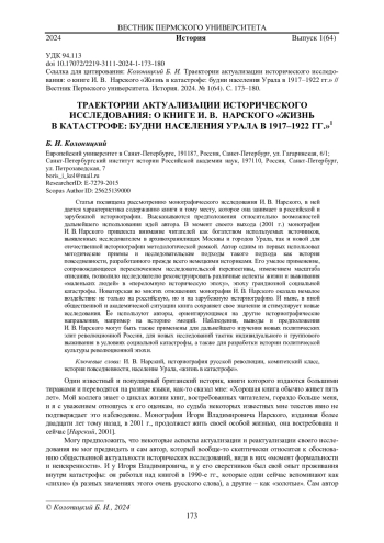 Статья посвящена рассмотрению монографического исследования И. В. Нарского, в ней дается характеристика содержанию книги и тому месту, которое она занимает в российской и зарубежной историографии. Высказываются предположения относительно возможностей дальнейшего использования идей автора. В момент своего выхода (2001 г.) монография И. В. Нарского привлекла внимание читателей как богатством используемых источников, выявленных исследователем в архивохранилищах Москвы и городов Урала, так и новой для отечественной историографии методологической рамкой. Автор одним из первых использовал методические приемы и исследовательские подходы такого подхода как история повседневности, разработанного прежде всего немецкими историками. Его умелое применение, сопровождающееся переключением исследовательской перспективы, изменением масштаба описания, позволило исследователю реконструировать различные аспекты жизни и выживания «маленьких людей» в «переломную историческую эпоху», эпоху грандиозной социальной катастрофы. Новаторская во многих отношениях монография И. В. Нарского оказала немалое воздействие не только на российскую, но и на зарубежную историографию. И ныне, в иной общественной и академической ситуации книга сохраняет свое значение и стимулирует новые исследования. Ее используют авторы, ориентирующиеся на другие историографические направления, например на историю эмоций. Наблюдения, выводы и предположения И. В. Нарского могут быть также применены для дальнейшего изучения новых политических элит революционной России, для новых исследований тактик индивидуального и группового выживания в условиях социальной катастрофы, а также для разработки истории политической культуры революционной эпохи.