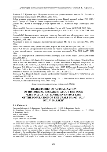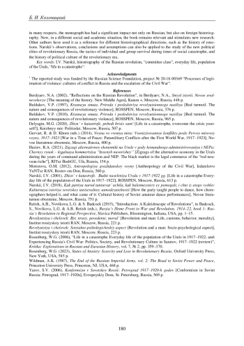 14. 	Rosenberg W.G. Zhizn v katastrofe: Budni naseleniia Urala v 1917-1922 gg, and: Experiencing Russia’s Civil War: Politics, Society, and Revolutionary Culture in Saratov, 1917-1922 (review) // Kritika: Explorations in Russian and Eurasian History. 2006. Vol. 7, no. 2. P. 359-370.