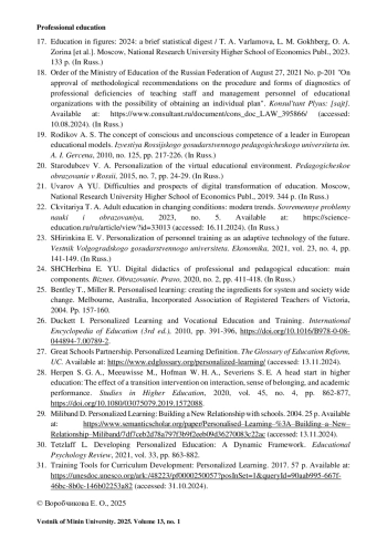 10. Зеер Э. Ф. Персонализированное образование - инновационный тренд современной профессиональной подготовки // Теория и методика профессионального образования. 2022. № 9. С. 33-40.