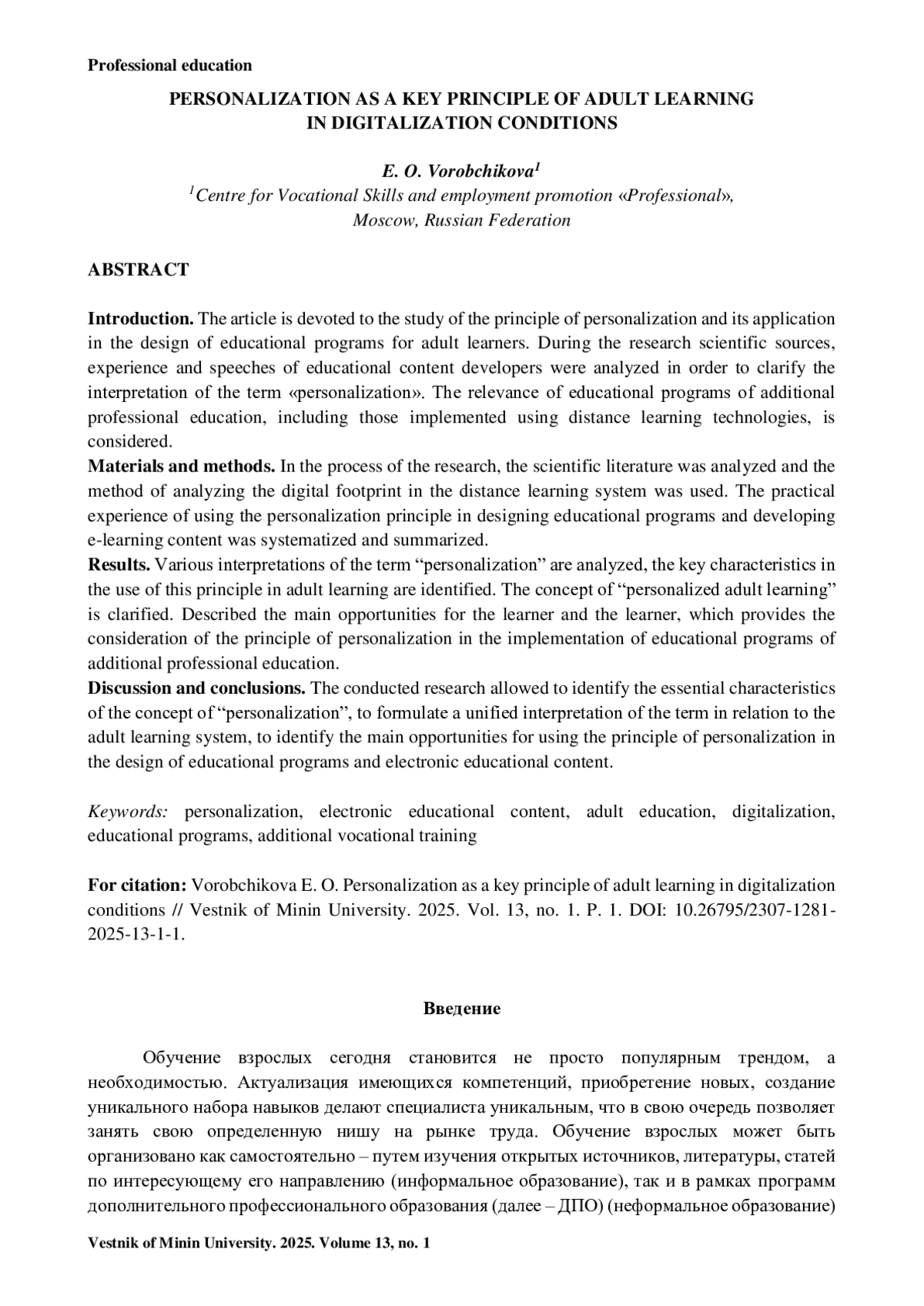 Введение. Статья посвящена изучению принципа персонализации и его применения при проектировании образовательных программ для взрослых обучающихся. В ходе исследования были проанализированы научные источники, опыт и выступления разработчиков образовательного контента с целью уточнения толкования термина «персонализация». Рассмотрена актуальность образовательных программ дополнительного профессионального образования, в том числе реализованных с использованием дистанционных образовательных технологий.