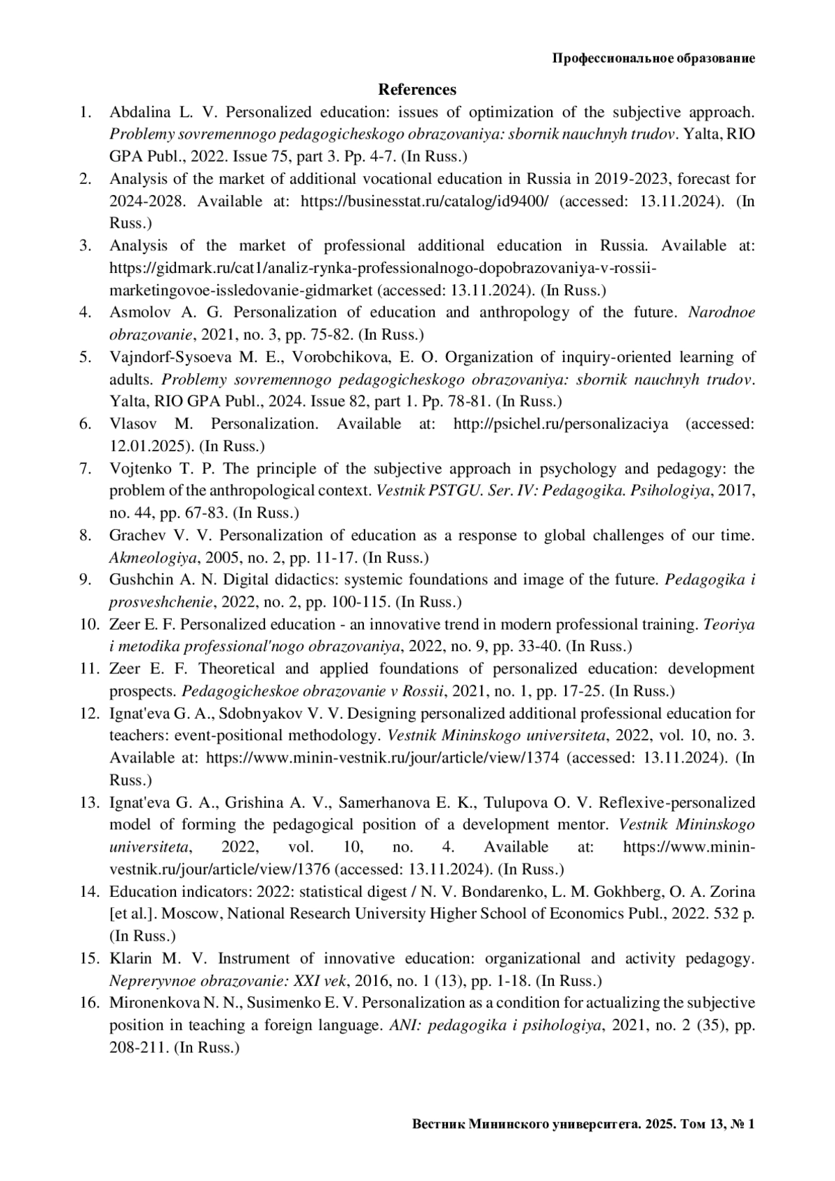 1. Абдалина Л. В. Персонализированное образование: вопросы оптимизации субъектного подхода // Проблемы современного педагогического образования: сборник научных трудов. Ялта: РИО ГПА, 2022. Вып. 75, ч. 3. С. 4-7.