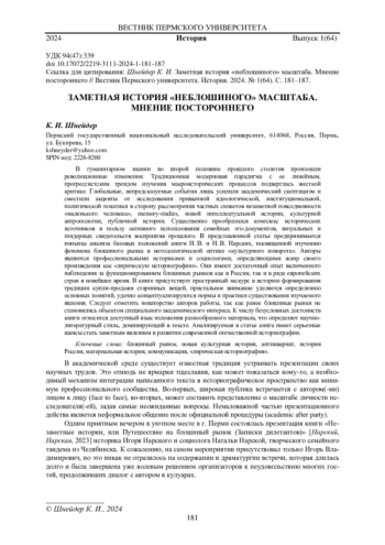 В 2024 г. 60-летний юбилей отмечает известный историк, специалист по интеллектуальной истории России, доктор исторических наук, заведующий кафедрой истории и археологии Пермского государственного национального исследовательского университета К. И. Шнейдер. В публикации представлены написанные в различной стилистике заметки о разных этапах его интеллектуальной биографии коллегами и друзьями по научному цеху. О. Л. Лейбович размышляет о начальном этапе интеллектуальной биографии профессора К. И. Шнейдера (1986-1993), обращая внимание на поиски жизненного пути выпускника исторического факультета Пермского госуниверситета, затрагивает проблему выбора, перед ним стоящего. Особое место занимают сюжеты, связанные с научным сотрудничеством К. И. Шнейдера с профессором З. И. Файнбургом. Представлены идеи, развитые Константином Ильичом в его кандидатской диссертации. В. В. Шелохаев откликается на выдвинутую К. И. Шнейдером концепцию раннего русского либерализма, принципиальные положения которой были обоснованы в монографии и докторской диссертации юбиляра (2013). И. В. Нарский обращается к личному опыту многолетнего профессионального и дружеского общения с Константином Ильичом как к инструменту создания эскиза интеллектуальной биографии специалиста по интеллектуальной истории. Человеческое измерение исследователя и исследуемого, несмотря на ироничный стиль изложения, становится при этом органичным компонентом интеллектуальной (авто)рефлексии.