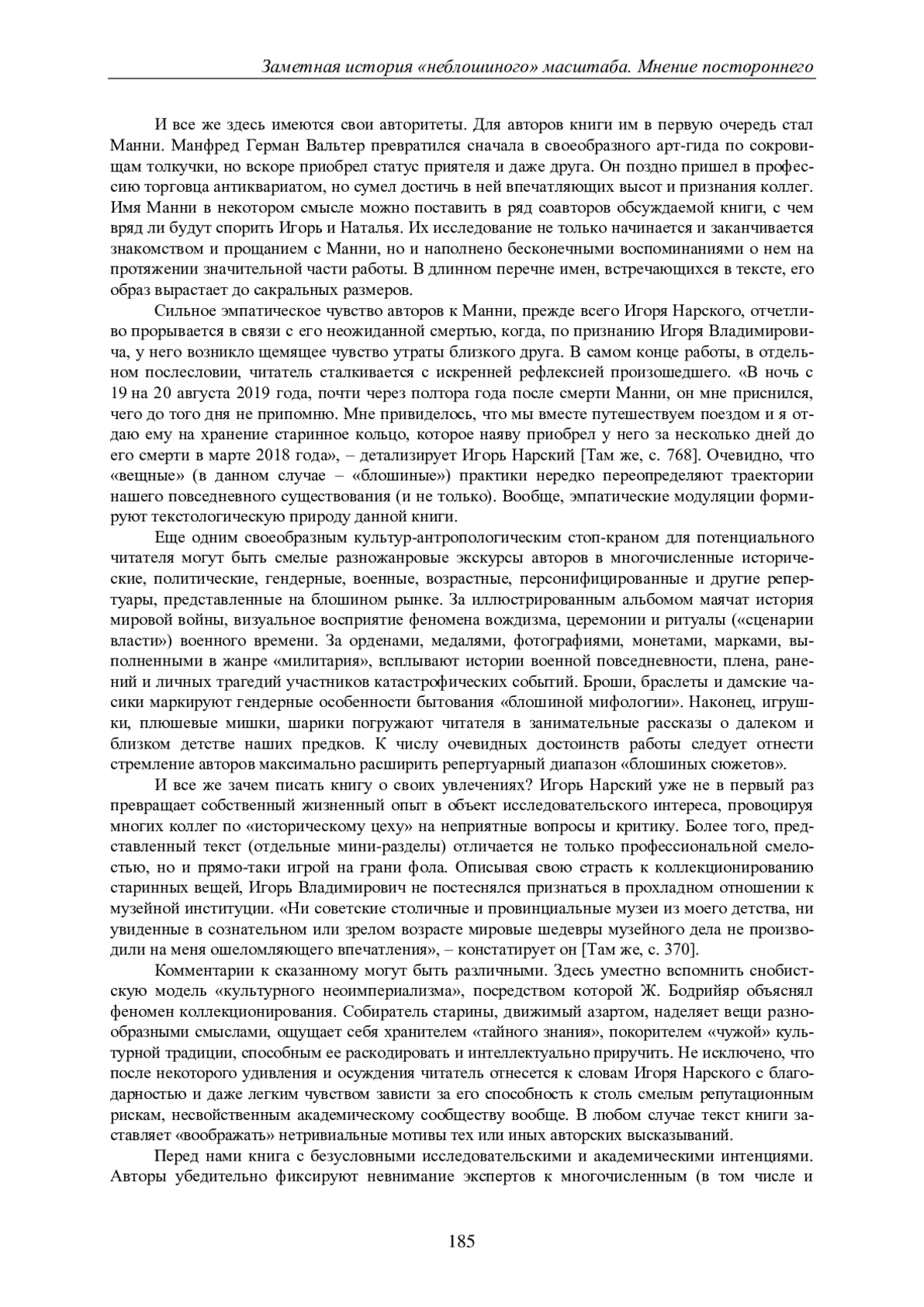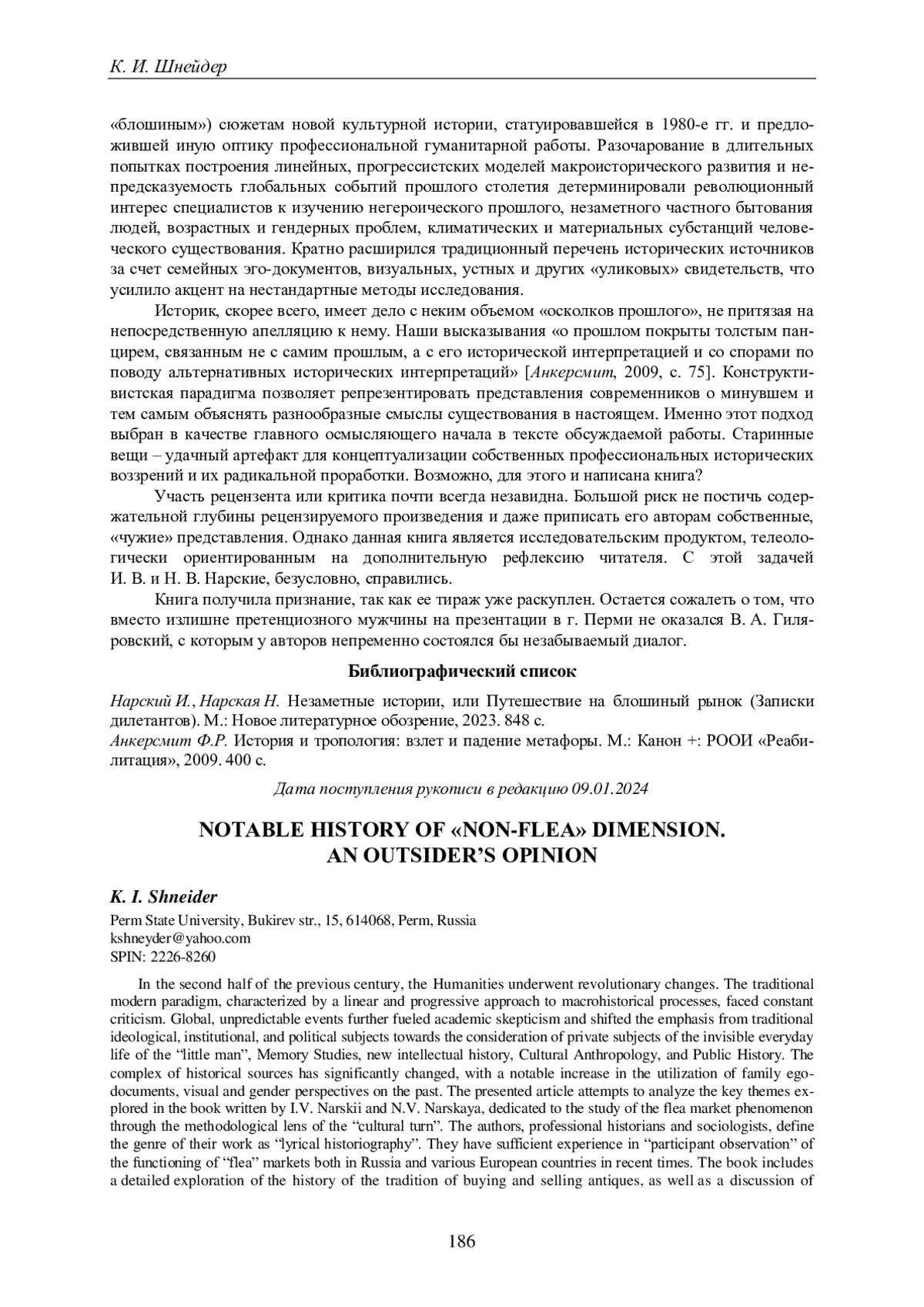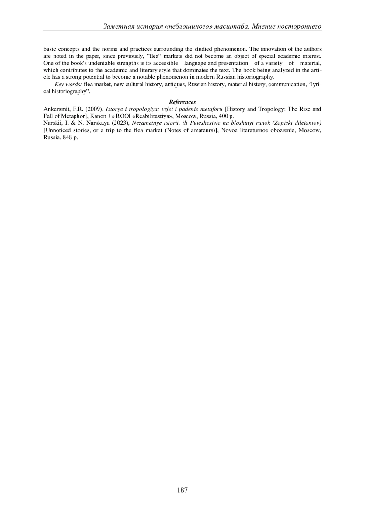 В гуманитарном знании во второй половине прошлого столетия произошли революционные изменения. Традиционная модерновая парадигма с ее линейным, прогрессистским трендом изучения макроисторических процессов подверглась жесткой критике. Глобальные, непредсказуемые события лишь усилили академический скептицизм и сместили акценты от исследования привычной идеологической, институциональной, политической тематики в сторону рассмотрения частных сюжетов незаметной повседневности «маленького человека», memory-studies, новой интеллектуальной истории, культурной антропологии, публичной истории. Существенно преобразился комплекс исторических источников в пользу активного использования семейных эго-документов, визуальных и гендерных свидетельств восприятия прошлого. В представленной статье предпринимается попытка анализа базовых положений книги И. В. и Н. В. Нарских, посвященной изучению феномена блошиного рынка в методологической оптике «культурного поворота». Авторы являются профессиональными историками и социологами, определяющими жанр своего произведения как «лирическую историографию». Они имеют достаточный опыт включенного наблюдения за функционированием блошиных рынков как в России, так и в ряде европейских стран в новейшее время. В книге присутствует пространный экскурс в историю формирования традиции купли-продажи старинных вещей, пристальное внимание уделяется определению основных понятий, удачно концептуализируются нормы и практики существования изучаемого явления. Следует отметить новаторство авторов работы, так как ранее блошиные рынки не становились объектом специального академического интереса. К числу безусловных достоинств книги относится доступный язык изложения разнообразного материала, что определяет научно-литературный стиль, доминирующий в тексте. Анализируемая в статье книга имеет серьезные шансы стать заметным явлением в развитии современной отечественной историографии.