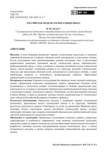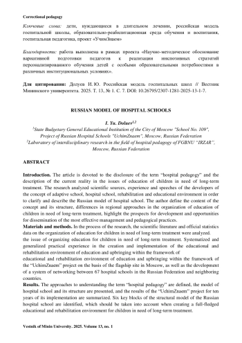 Введение. Статья посвящена раскрытию термина «госпитальная педагогика» и описанию современной реальности в вопросах обучения детей, нуждающихся в длительном лечении. В ходе исследования были проанализированы научные источники, опыт и выступления разработчиков концепции адаптивной школы, госпитальной школы, образовательно-реабилитационной среды с целью уточнения и описания российской модели госпитальной школы. Автор выделяет содержание понятия и его структуру, различия в региональных подходах при организации обучения детей, нуждающихся в длительном лечении, а также перспективы развития и возможности распространения наиболее эффективных управленческих и педагогических практик.