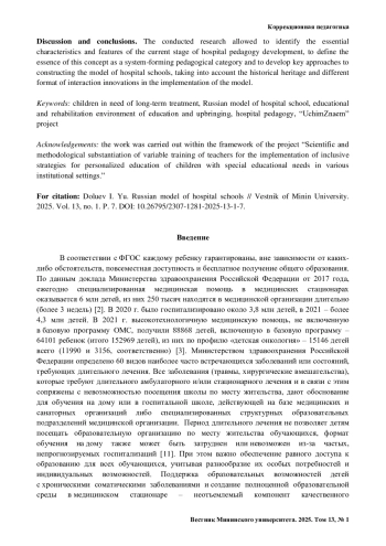 Обсуждение и заключения. Проведенное исследование позволило выявить сущностные характеристики и особенности современного этапа развития госпитальной педагогики, определить сущность данного понятия как системообразующей педагогической категории и разработать ключевые подходы конструирования модели госпитальных школ с учетом исторического наследия и разного формата инноваций взаимодействия при реализации модели.