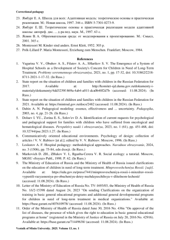 1. Вагарина В. В., Обухов А. С., Филатов А. А., Шариков С. В. Появление системы госпитальных школ как развитие заботы общества о детях, нуждающихся в длительном лечении // Проблемы современного образования. 2021. № 1. С. 17-32. https://doi.org/10.31862/2218-8711-2021-1-17-32.