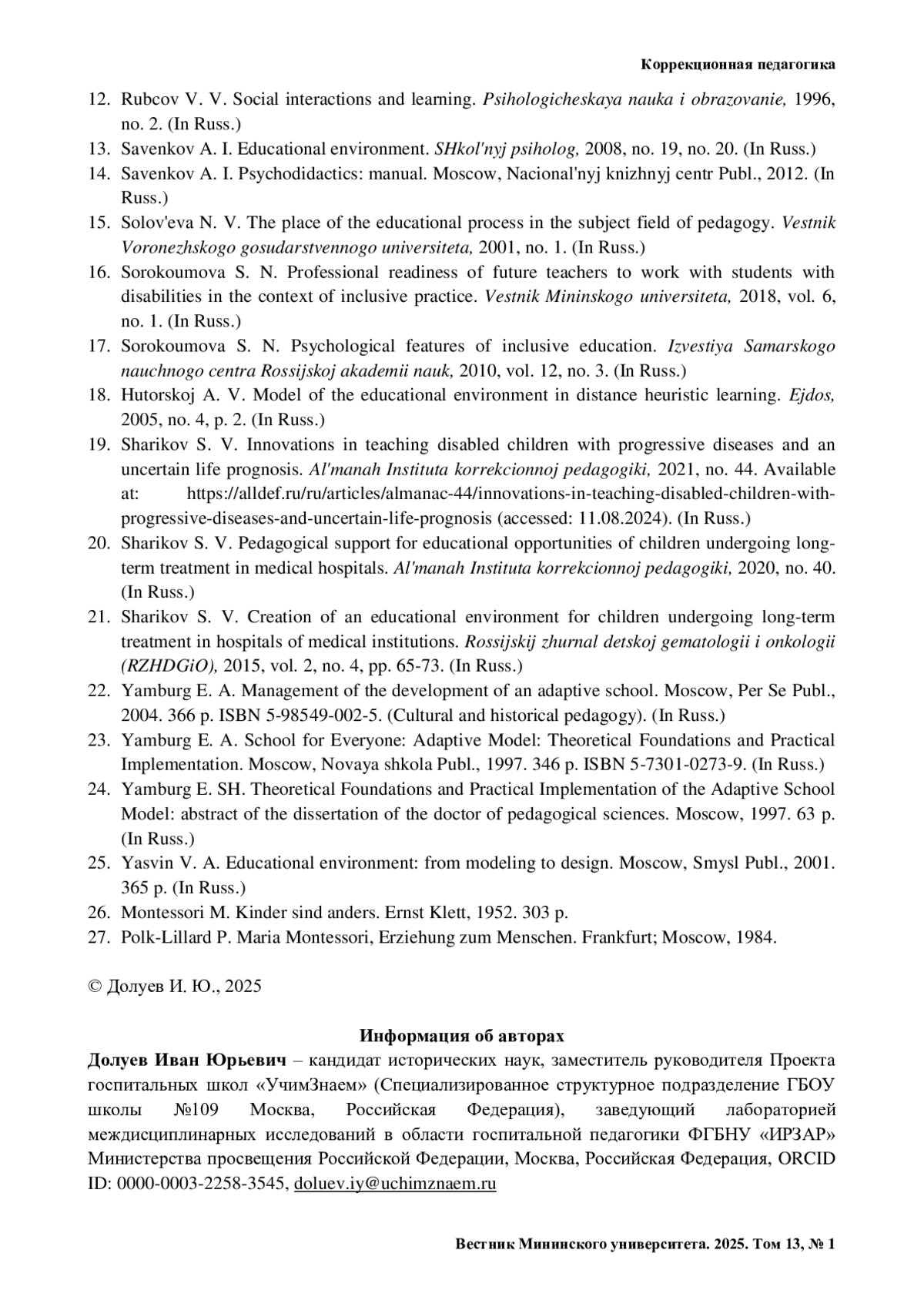 20. Шариков С. В. Педагогическая поддержка образовательных возможностей детей, находящихся на длительном лечении в медицинских стационарах // Альманах Института коррекционной педагогики. 2020. № 40.