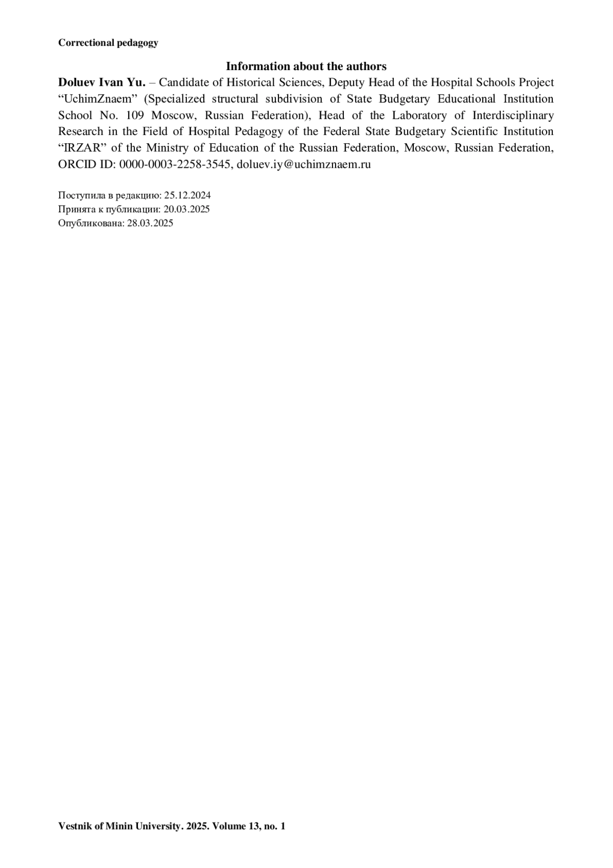 7. Лоскутов А. Ф. Госпитальная педагогика: методологические подходы // Народное образование. 2024. № 3 (1506). С. 75-84. EDN DXOCJT.