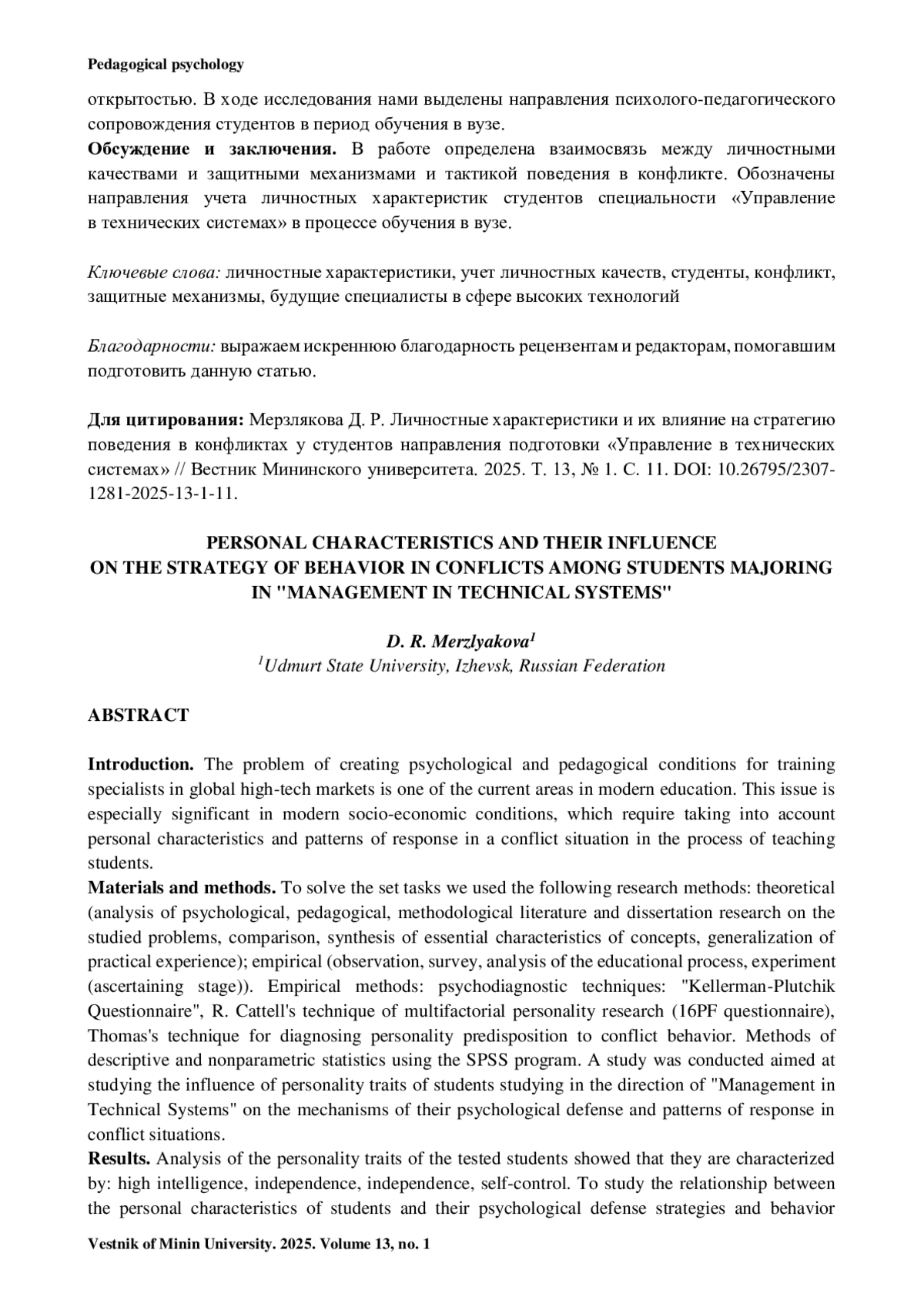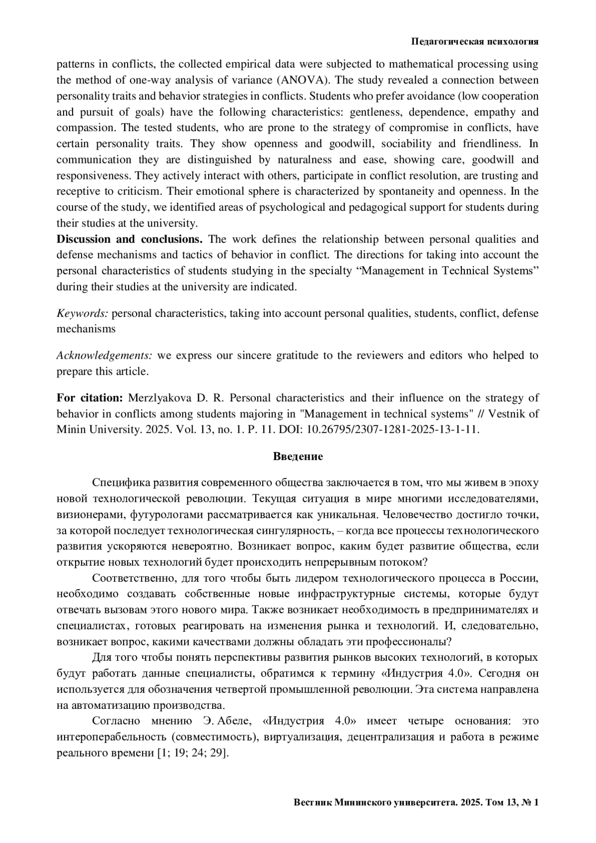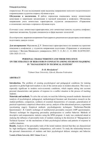 Обсуждение и заключения. В работе определена взаимосвязь между личностными качествами и защитными механизмами и тактикой поведения в конфликте. Обозначены направления учета личностных характеристик студентов специальности «Управление в технических системах» в процессе обучения в вузе.
