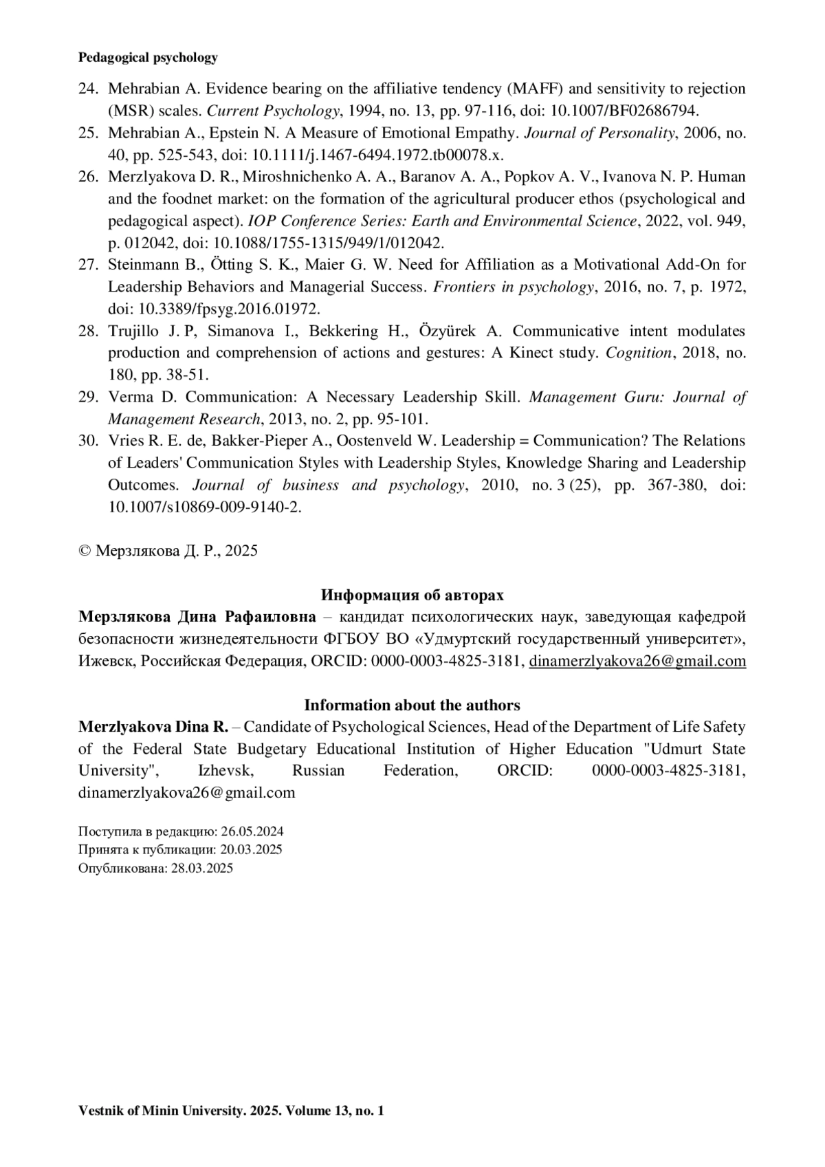 27. Steinmann B., Ötting S. K., Maier G. W. Need for Affiliation as a Motivational Add-On for Leadership Behaviors and Managerial Success // Frontiers in psychology. 2016. No. 7. P. 1972. https://doi.org/10.3389/fpsyg.2016.01972.