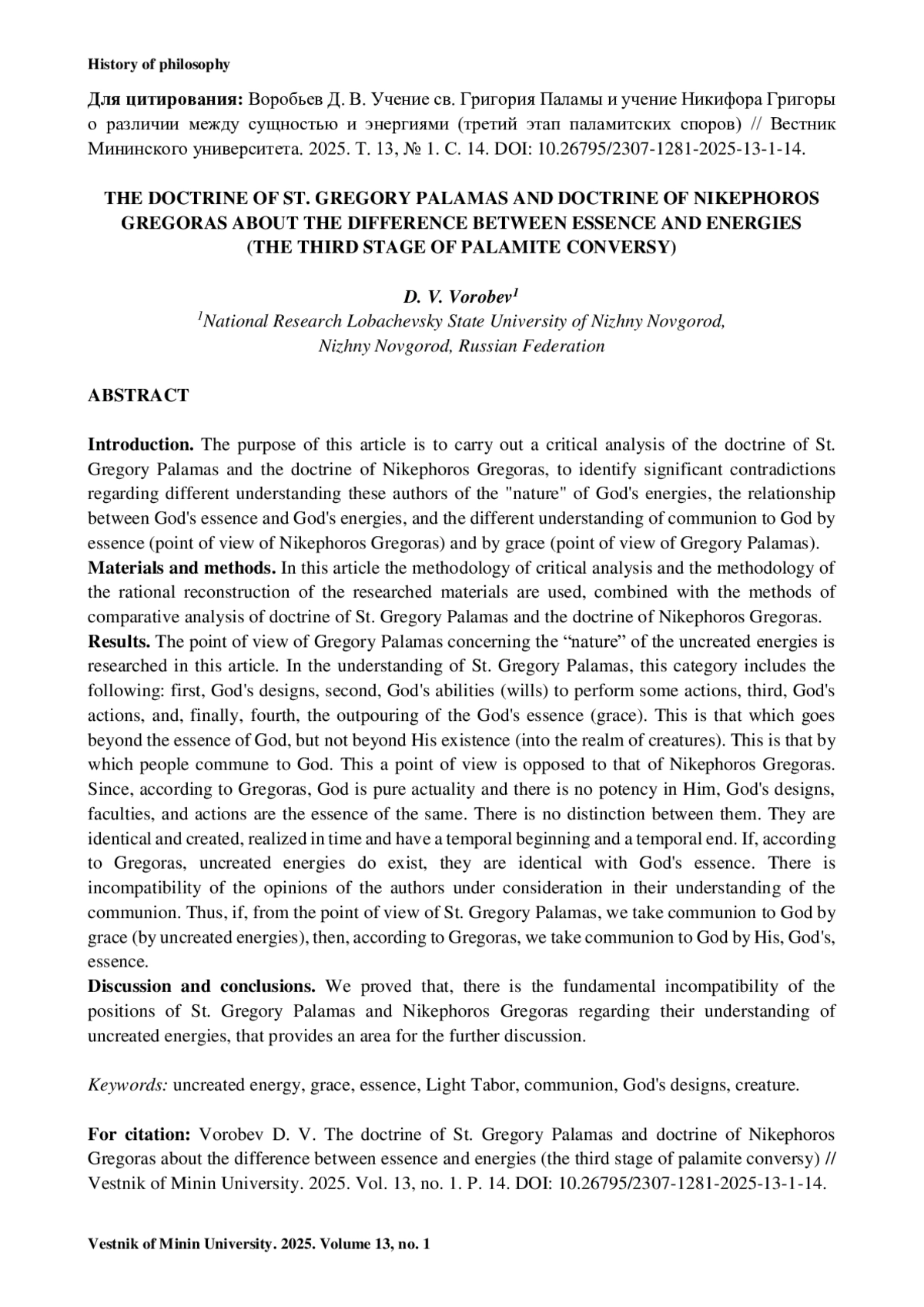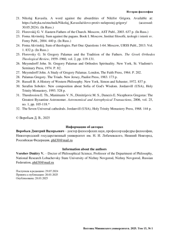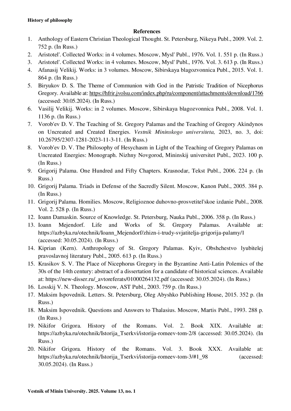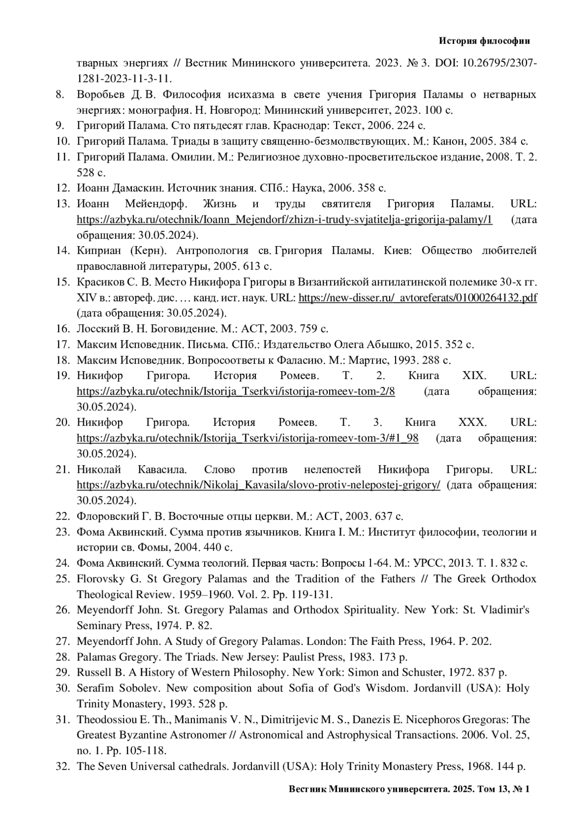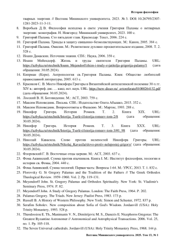7. Воробьев Д. В. Учение св. Григория Паламы и учение Григория Акиндина о нетварных и тварных энергиях // Вестник Мининского университета. 2023. № 3. https://doi.org/10.26795/2307-1281-2023-11-3-11.