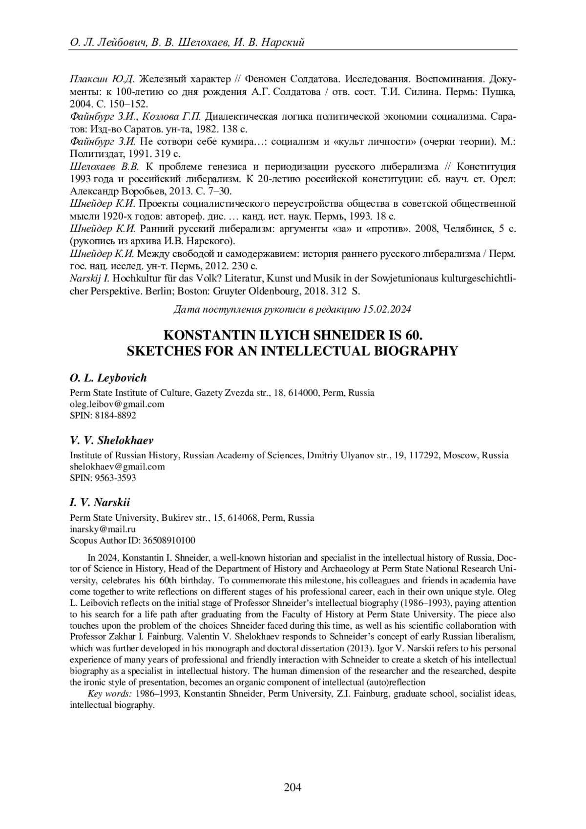 В 2024 г. 60-летний юбилей отмечает известный историк, специалист по интеллектуальной истории России, доктор исторических наук, заведующий кафедрой истории и археологии Пермского государственного национального исследовательского университета К. И. Шнейдер. В публикации представлены написанные в различной стилистике заметки о разных этапах его интеллектуальной биографии коллегами и друзьями по научному цеху. О. Л. Лейбович размышляет о начальном этапе интеллектуальной биографии профессора К. И. Шнейдера (1986-1993), обращая внимание на поиски жизненного пути выпускника исторического факультета Пермского госуниверситета, затрагивает проблему выбора, перед ним стоящего. Особое место занимают сюжеты, связанные с научным сотрудничеством К. И. Шнейдера с профессором З. И. Файнбургом. Представлены идеи, развитые Константином Ильичом в его кандидатской диссертации. В. В. Шелохаев откликается на выдвинутую К. И. Шнейдером концепцию раннего русского либерализма, принципиальные положения которой были обоснованы в монографии и докторской диссертации юбиляра (2013). И. В. Нарский обращается к личному опыту многолетнего профессионального и дружеского общения с Константином Ильичом как к инструменту создания эскиза интеллектуальной биографии специалиста по интеллектуальной истории. Человеческое измерение исследователя и исследуемого, несмотря на ироничный стиль изложения, становится при этом органичным компонентом интеллектуальной (авто)рефлексии.