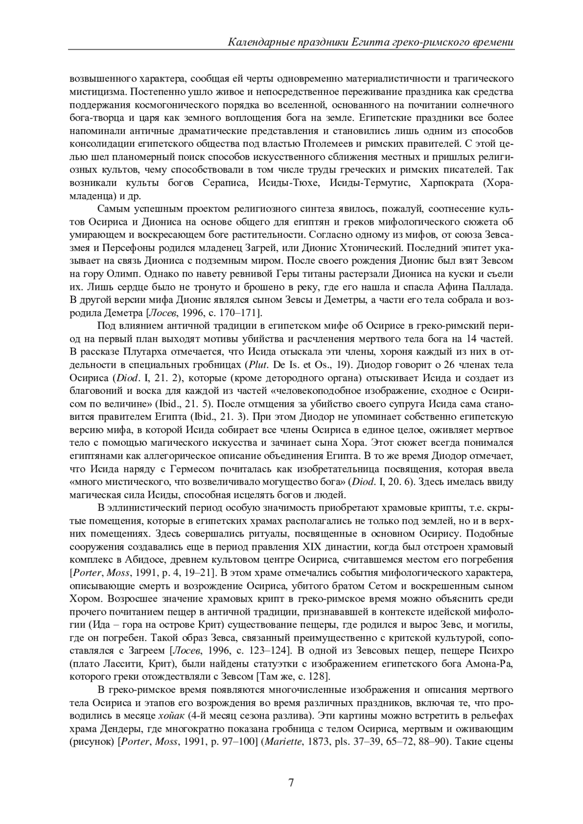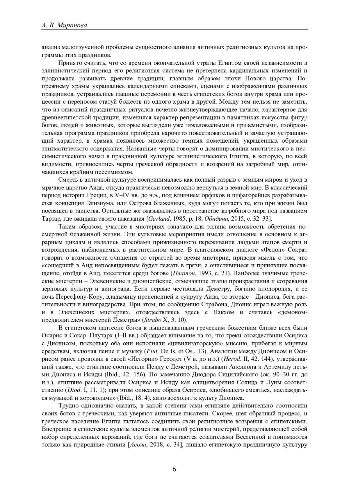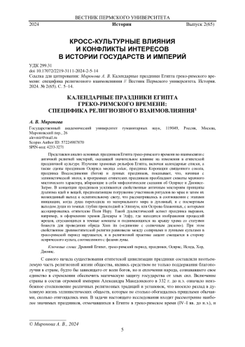 Представлен анализ основных праздников Египта греко-римского времени во взаимосвязи с античной религией мистерий, оказавшей значительное влияние на изменения в египетской праздничной культуре. Изучение храмовых рельефов Египта, включая календарные списки, а также сцены праздников Осириса месяца хойак, праздника Коронации священного сокола, праздника Воссоединения (богов) и лунных праздников, показывает, что, начиная с эллинистической эпохи, в программах египетских праздников преобладают сюжеты мрачного мистического характера, вбирающие в себя мифологические сказания об Осирисе и Дионисе-Загрее. В концепции праздников усиливаются свойственные античным мистериям принципы дуализма идей и вещей, предполагающие погружение участников ритуалов во мрак и затем их неожиданный выход к ослепительному свету, что рассматривалось в соотношении с этапами инициации, когда душа переходила из материального мира в духовный, и с посмертным выходом души из темных глубин преисподней в Элизиум, или Острова блаженных, с которыми ассоциировались египетские Поля Иару. Такой дуалистический аспект праздника выражен, например, в оформлении храмов Дендеры и Эдфу, где находятся изображения процессий жрецов, спускающихся в темные комнаты и поднимающихся на крышу храма со статуями божеств для проведения обряда Xnm itn («единение с солнечным диском»). При этом свойственное древнеегипетской религии равновесие между солярными и лунными культами в греко-римской период нарушается, и в религиозной практике акцент смещается в сторону осирического культа, соотнесенного с фазами луны.