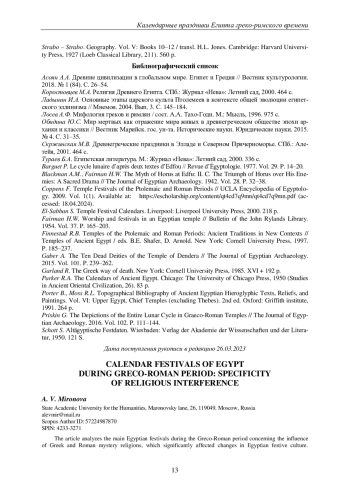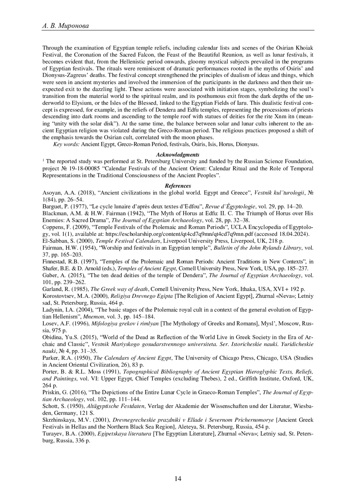 10. 	Coppens F. Temple Festivals of the Ptolemaic and Roman Periods // UCLA Encyclopedia of Egyptology. 2009. Vol. 1(1). Available at: https://escholarship.org/content/qt4cd7q9mn/qt4cd7q9mn.pdf (accessed: 18.04.2024).